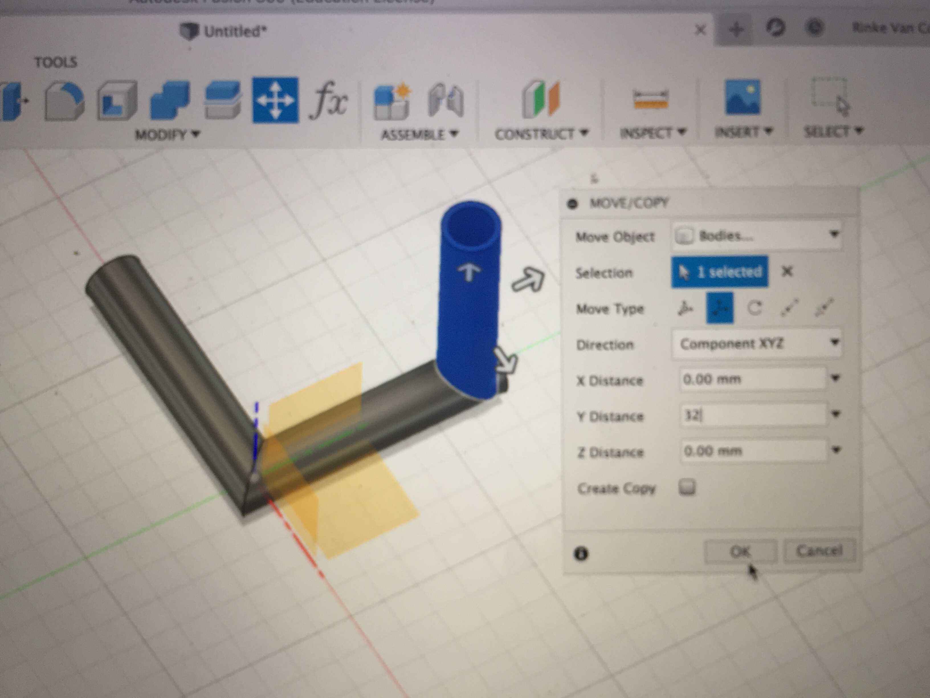 Again with Move/Copy Translate I moved it to the right position 32 on the Y-axes, witch is 40 mm minus 2x 4 mm radius of the tube.