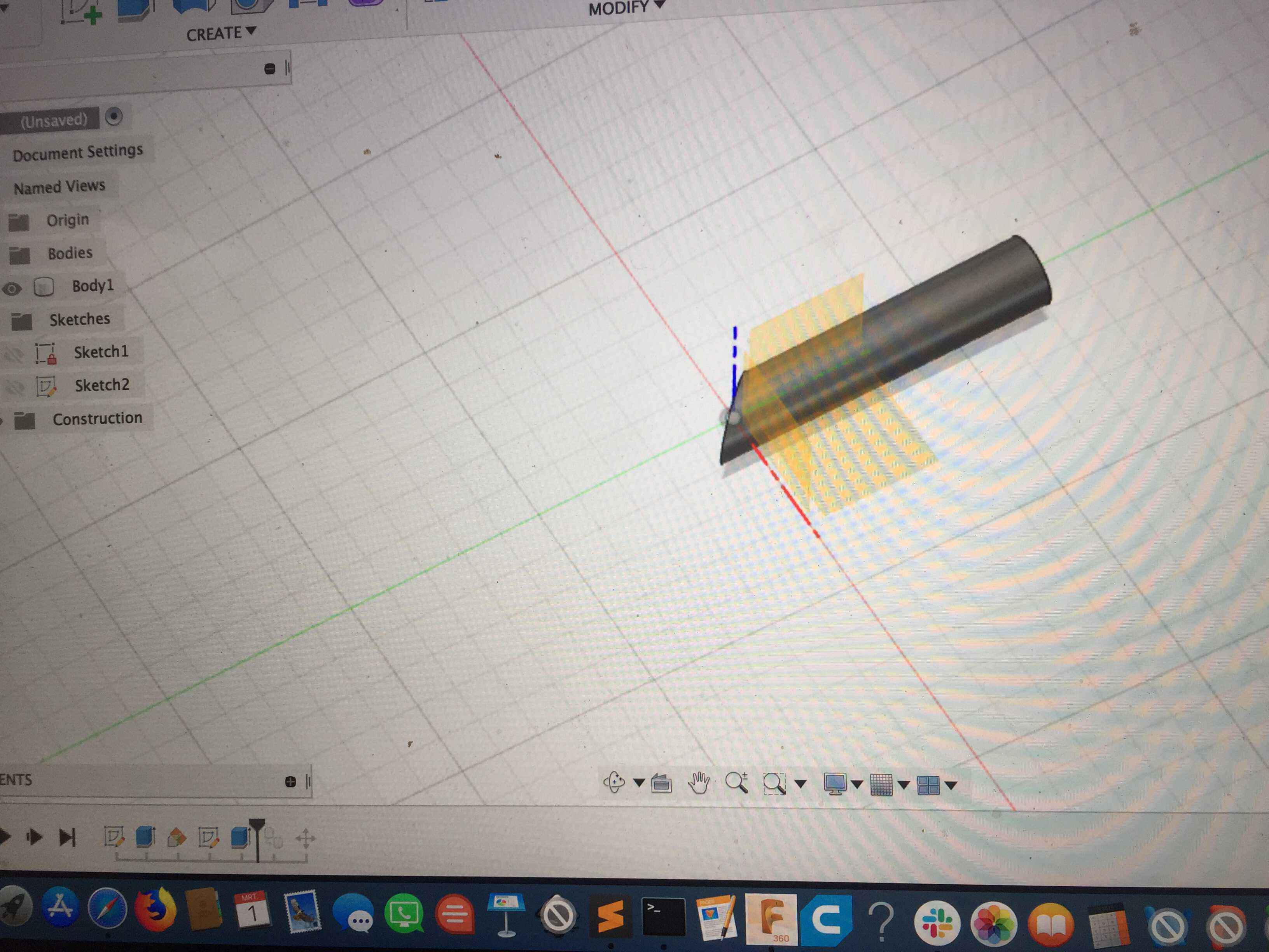 Now I needed to mitre the tube with a 45º angle. I made a 45º plane, placed it at the end of the tube and extrude/cut the tube.