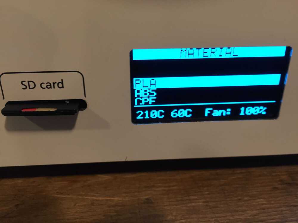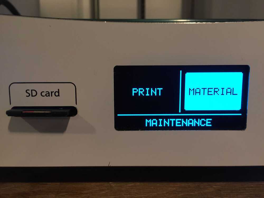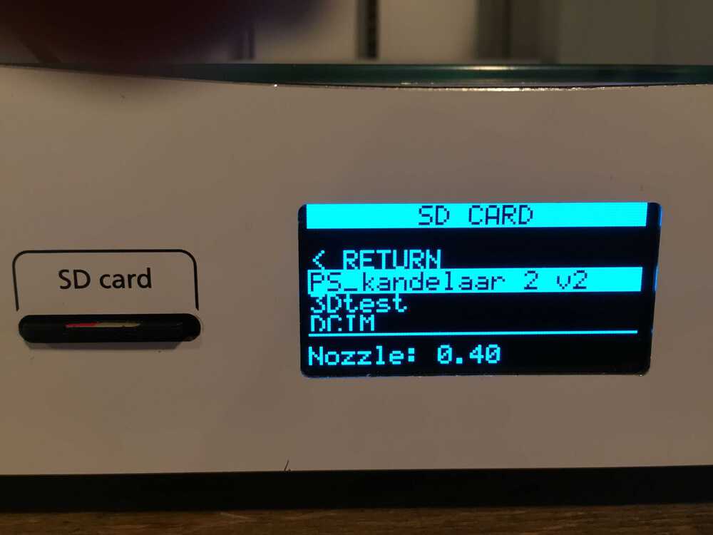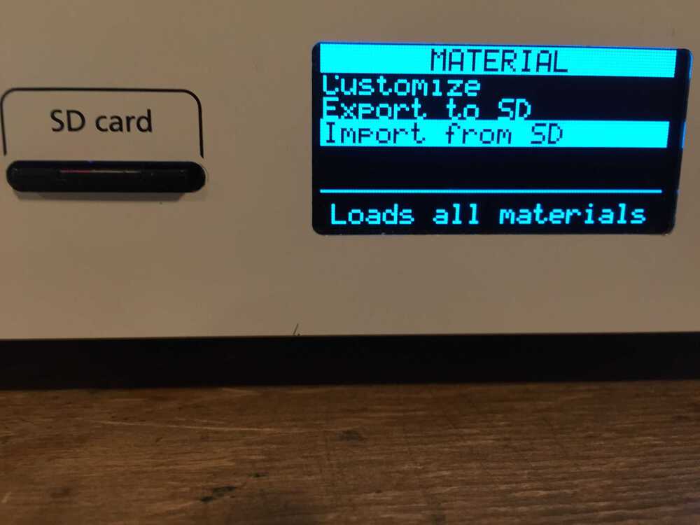 I wanted to send the file from the SD card to the printer so I selected Import from SD. I got a message that no file was found. I did not notice that I was in the material menu and not in the printer menu. Next time read the display better.