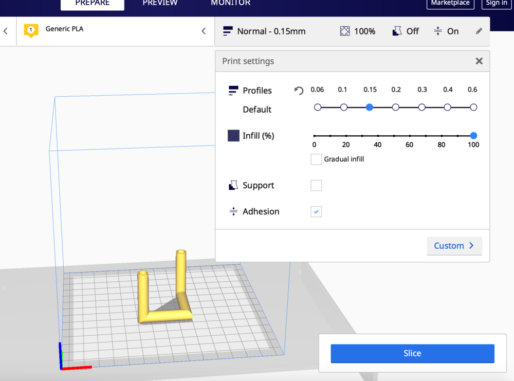 For Print settings I chose ‘Normal’ 0.15, for the Infill 100%. The infill will be in the space between the inner and outer side of the tubes.