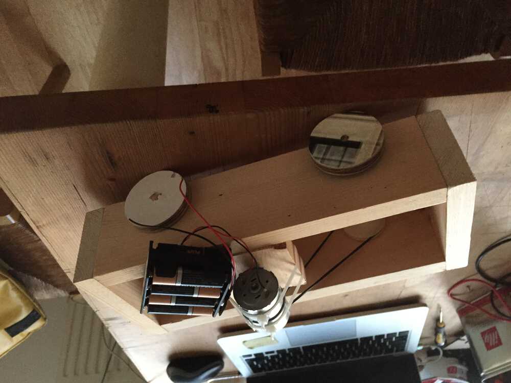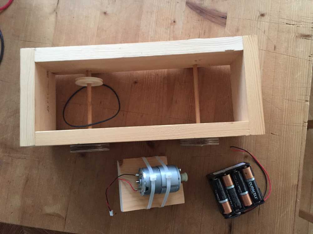 I used a motor I took out of a printer. On the axel I put a pulley, also from a printer. To connect them I used a rubber band. For 12 V power I used 8 AA batteries.