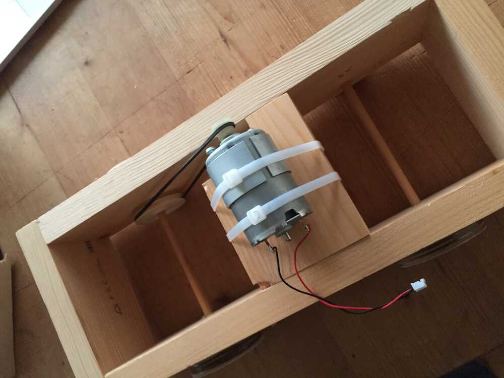 I tinkered a car. With a hole saw I sawed out 4 wheels out og 9 mm plywood. For the body work I used 18 mm pinewood. I was especialy interested if the drive would work.
