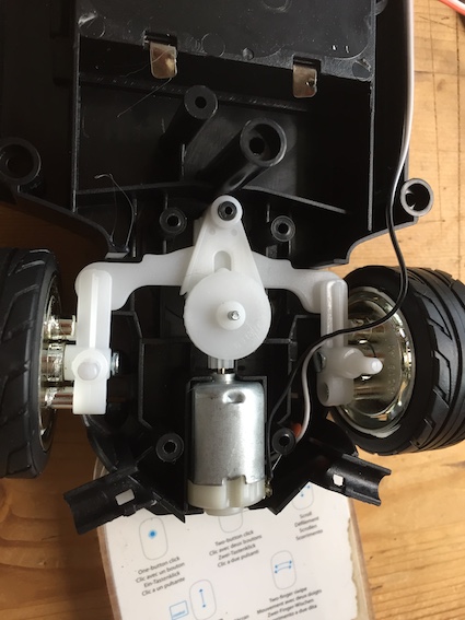 I bought a RC car and took it apart. The driving is quite simple: the moter is directly connected to the axel by gears. One on the motor one on the axel.