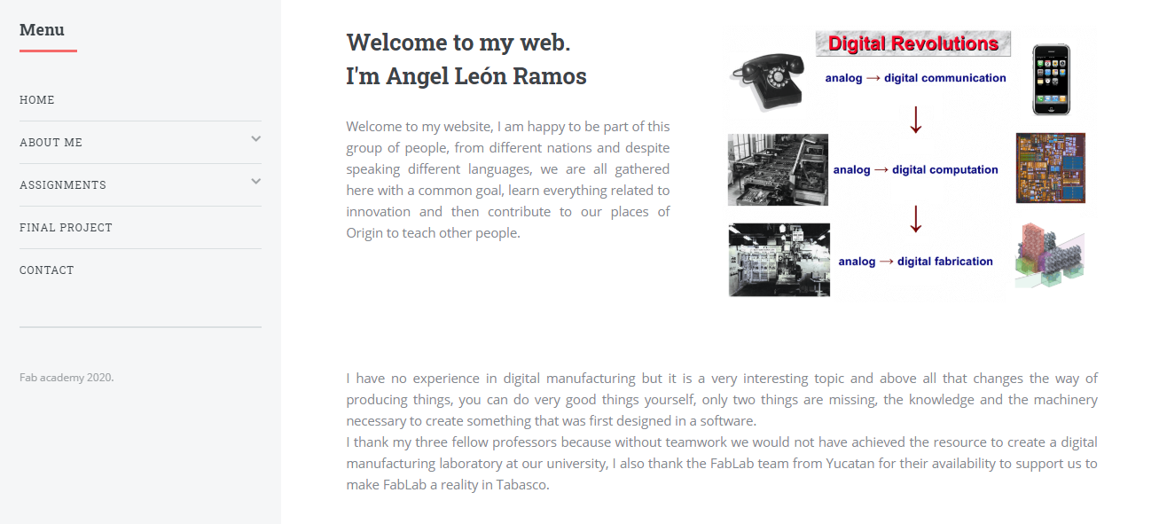 In this week I learned about the principles of project management and about creating my own website, that will be used for document my progress every week. This assignment is going to be useful for me, helping to remember how some tools work, manage all the information and assignments that we create and (most important) how we manage to solve and fix some problems through the way of the FabAcademy.Background.