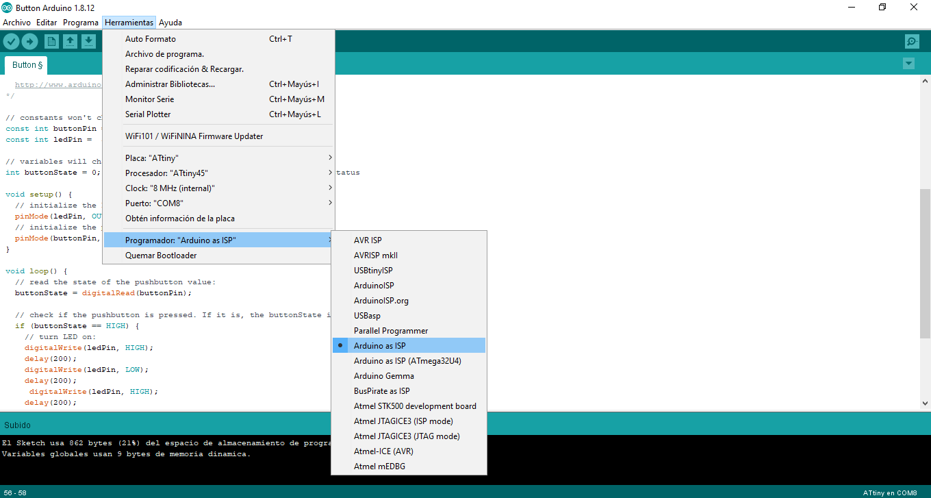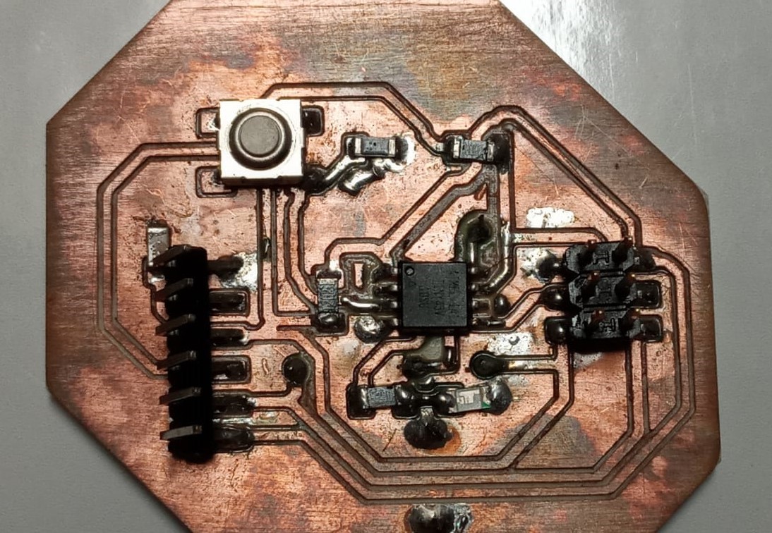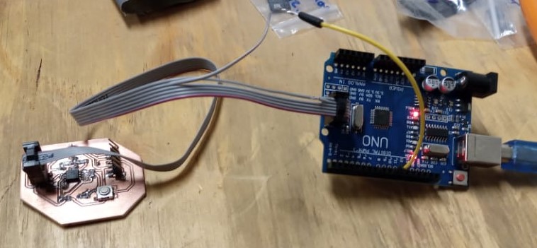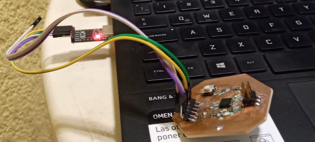 Now you have to program the attyny45, the code is shown below, remember that to program the led and the button you must check the pin where each one is connected in the diagram made in previous steps.const int buttonPin = 4; // the number of the pushbutton pin const int ledPin = 3; // the number of the LED pin // variables will change: int buttonState = 0; // variable for reading the pushbutton status void setup() { // initialize the LED pin as an output: pinMode(ledPin, OUTPUT); // initialize the pushbutton pin as an input: pinMode(buttonPin, INPUT); } void loop() { // read the state of the pushbutton value: buttonState = digitalRead(buttonPin); // check if the pushbutton is pressed. If it is, the buttonState is HIGH: if (buttonState == HIGH) { // turn LED on: digitalWrite(ledPin, HIGH); delay(200); digitalWrite(ledPin, LOW); delay(200); digitalWrite(ledPin, HIGH); delay(200); digitalWrite(ledPin, LOW); delay(200); digitalWrite(ledPin, HIGH); delay(200); digitalWrite(ledPin, LOW); delay(200); } else { // turn LED off: digitalWrite(ledPin, LOW); } }I really feel great emotion because my badge is already programmed, it was worth the hours invested in this assignment.