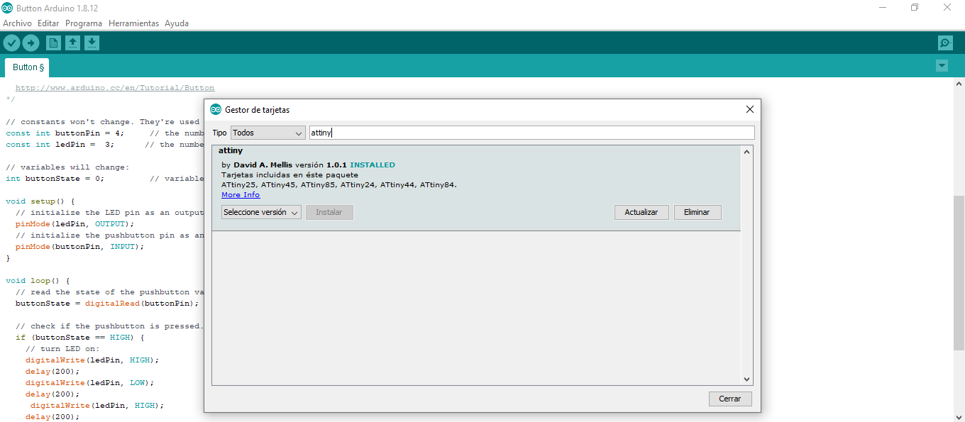 The next step is to go to the "Tools menu> Board> Card manager" and install attiny.