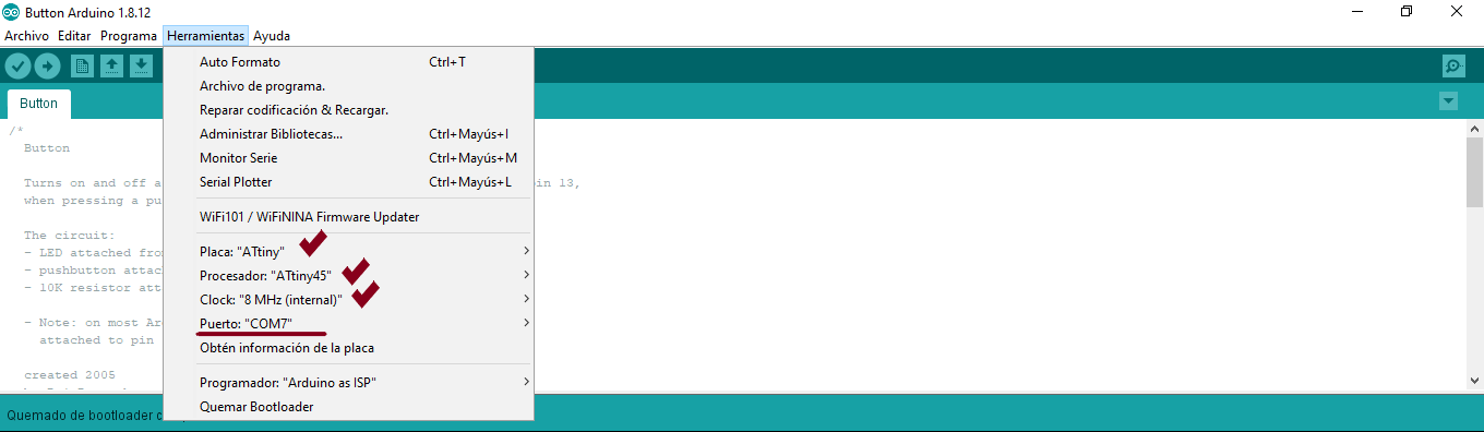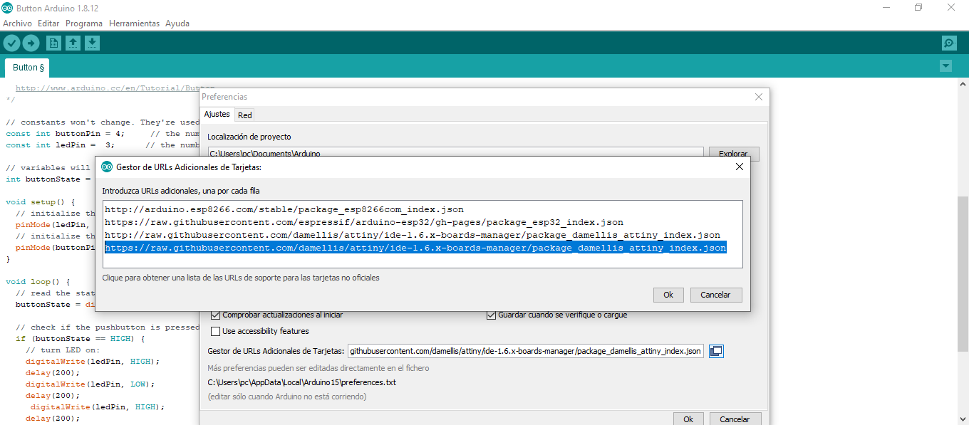 To prepare the newly manufactured attiny45 board, it is necessary to install the library in the arduino ide so that it recognizes the attiny45, this url (https://raw.githubusercontent.com/damellis/attiny/ide-1.6.x-boards-manager/ package_damellis_attiny_index.json) should be added in "preferences" (file menu> preferences).