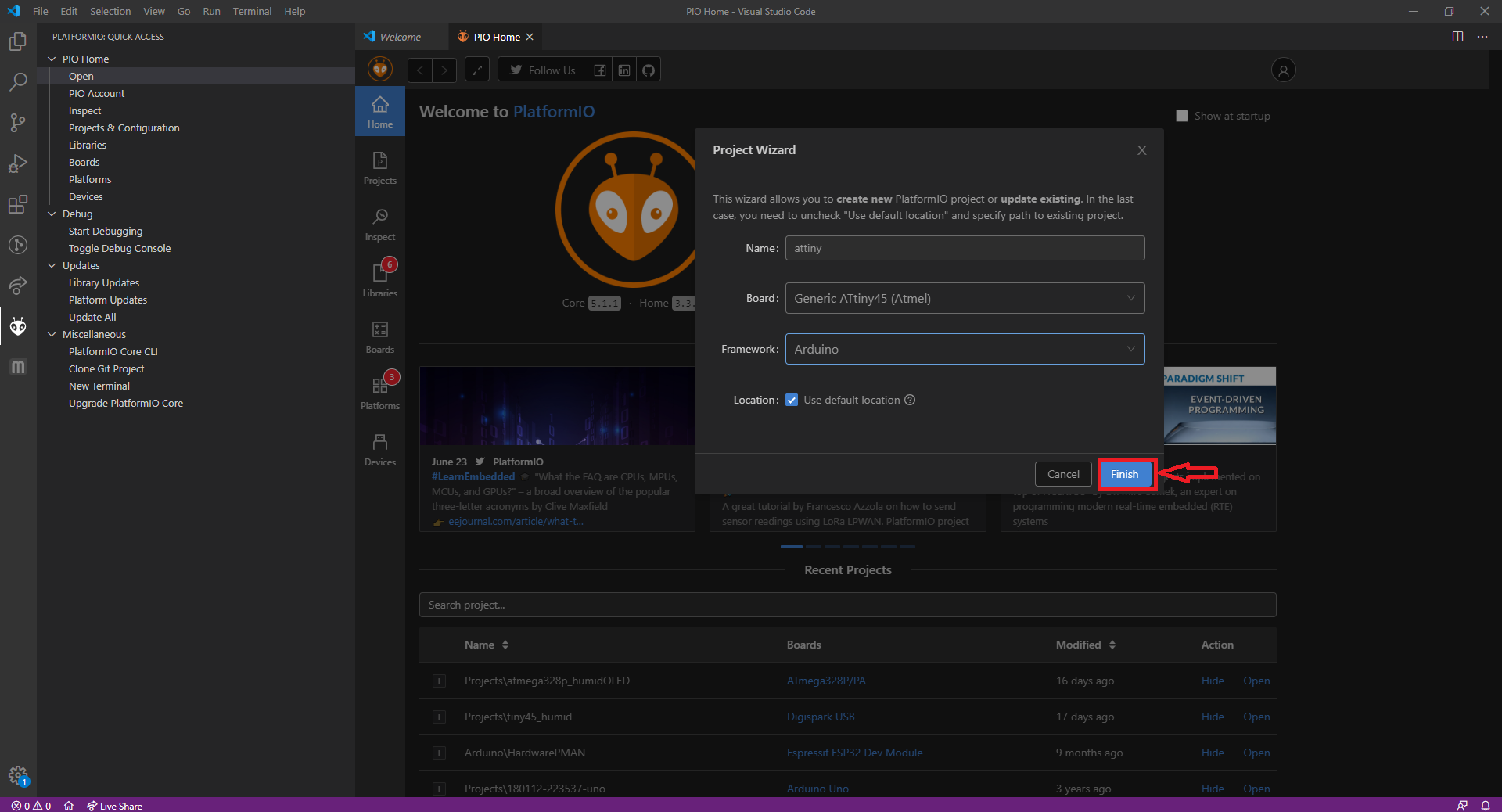 At the main window click on "New Project" then just fill the new window with the project name and the board (or mcu) you are going to use, in this case since I am testing a new IDE for the previous code I choosed as a board "Generic ATtiny45 (Atmel)"