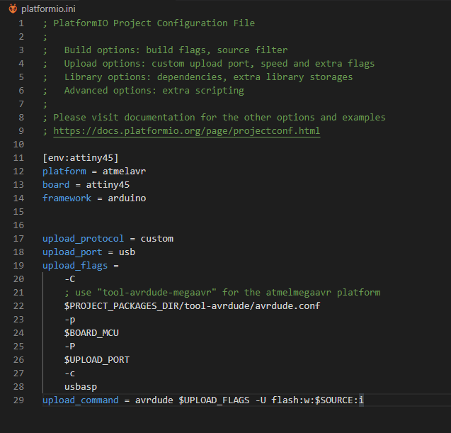 Since I am using a USBasp to program the board, I took from this page "https://docs.platformio.org/en/latest/platforms/atmelavr.html#upload-using-programmer" the configuration options to use such programmer