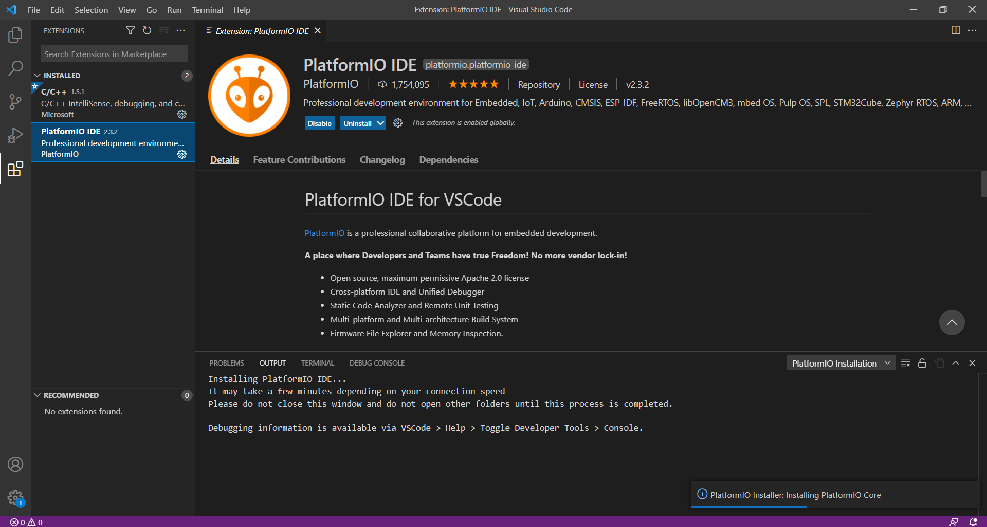 This is actually an extension for Visual Studio Code, so in order to install it go to the extensions page at the left bar (the icon below the play button with a bug) and search for PLatformIO.