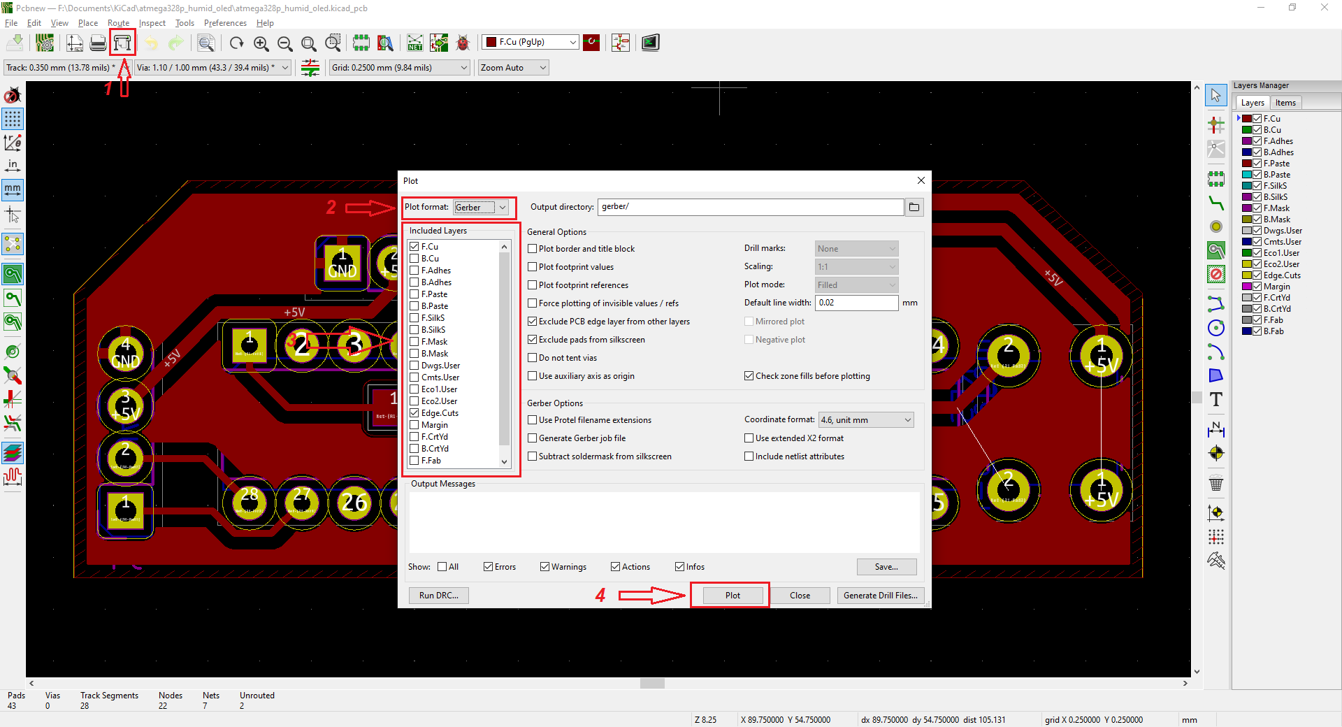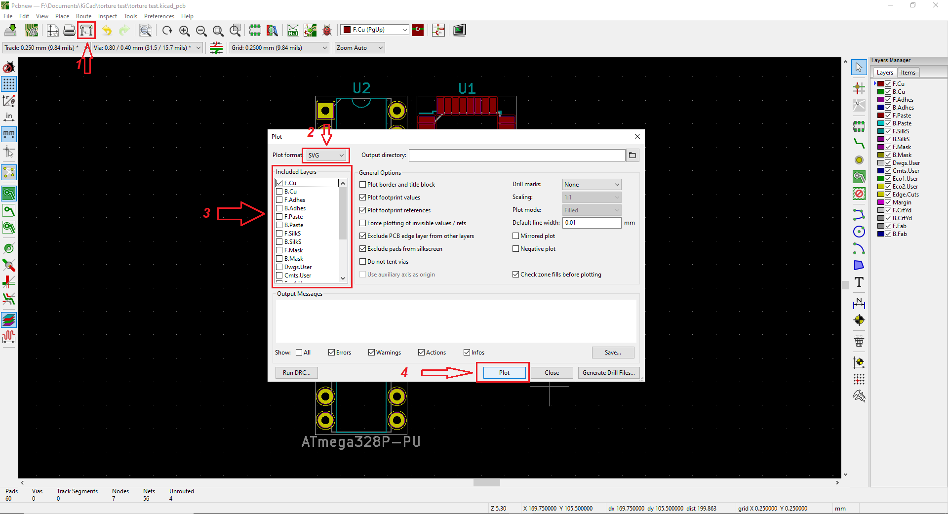 First, plot the layers F.cu and Edge.Cuts with plot format set as Gerber
