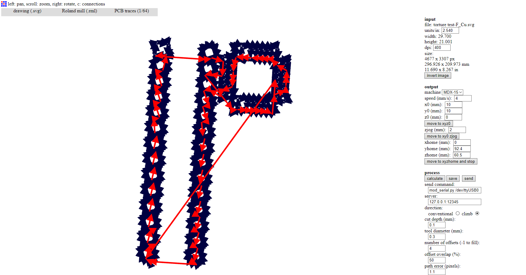 After loading the SVG to Fabmodules, using a tool with 0.3mm of diameter, the pads of the 32-TQFP package can't be milled at all, so DIP-28 is the one to go