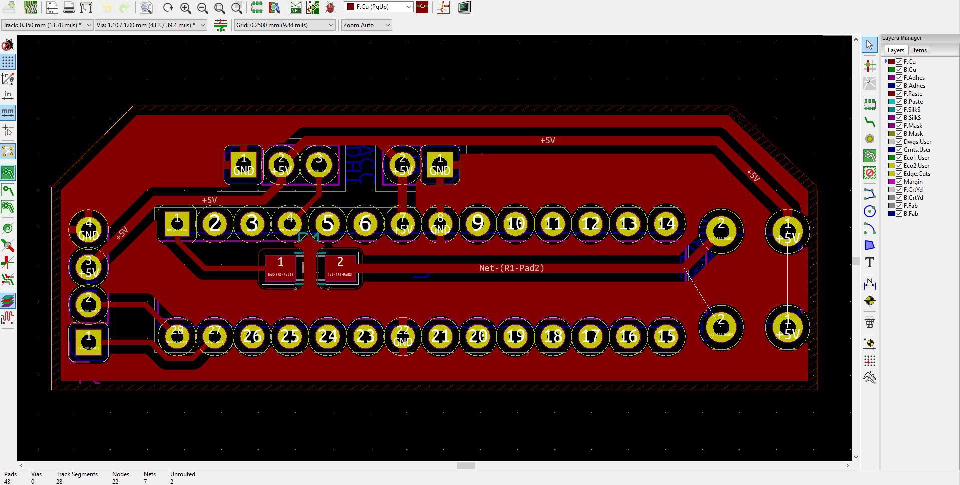 The next thing to do is to route the board, after moving and connecting the pads, it ends up looking like this: