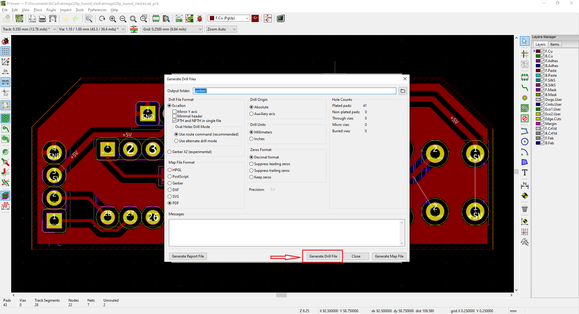 Then, click on "Generate Drill Files" and set everything like is at the image, finally, click on "Generate Drill File" at the bottom of the newly opened window