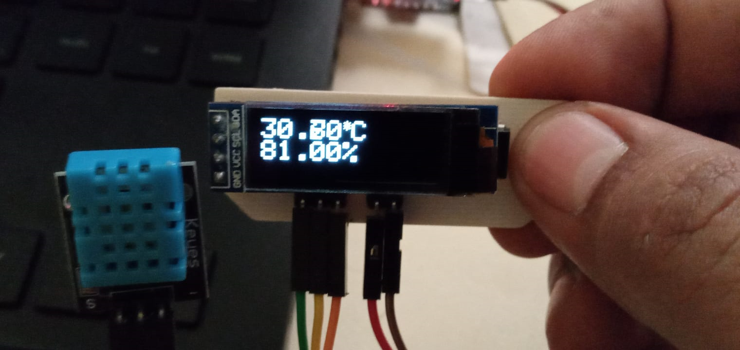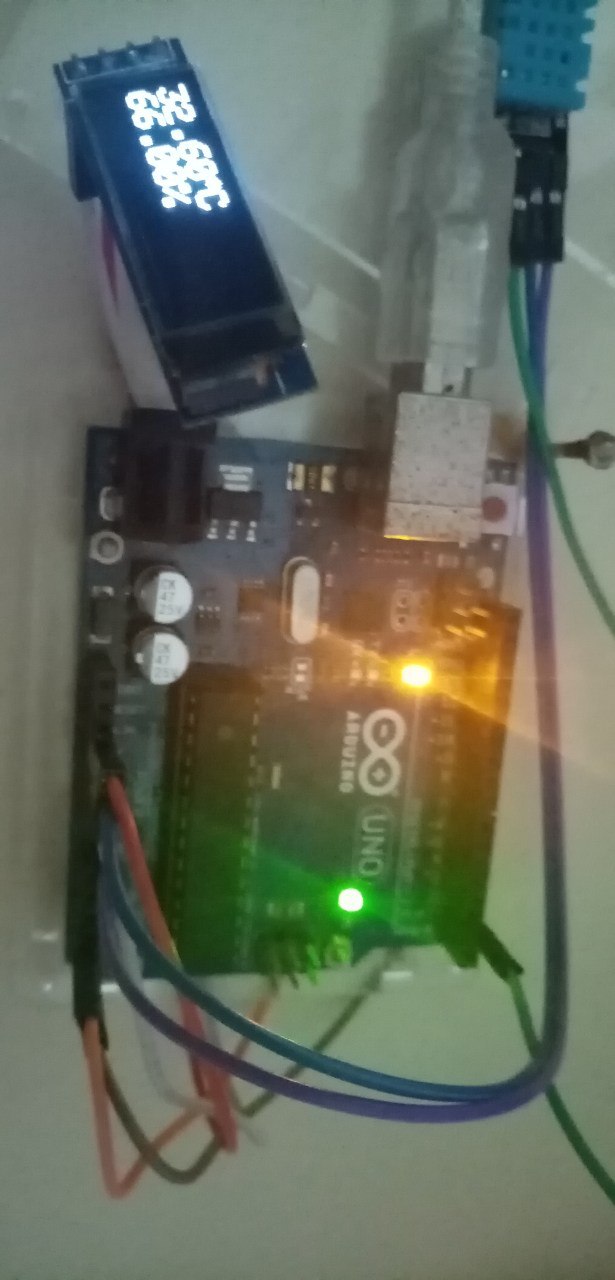 First, I did a little prototype using an Arduino UNO board with a DHT11 module and an SSD1306 128x32 OLED with the following connections