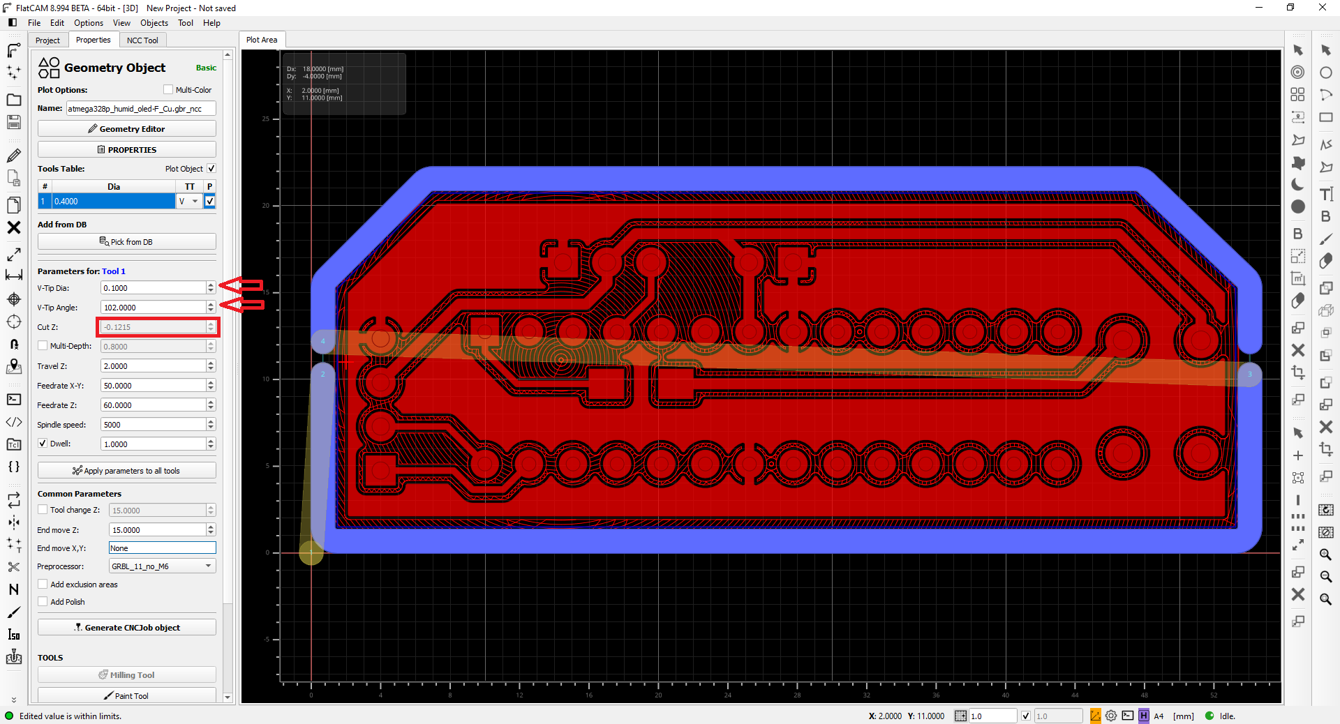 Once back at properties, the first thing to do is adjust the V-tip Dia and V-tip Angle to a value that changes Cut-Z to -0.12