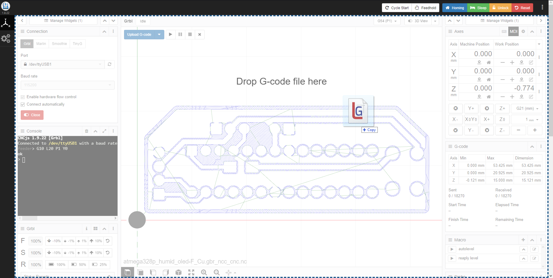 This machine uses CNC.js as its interface, just by drag and dropping the gcode (.nc or .gcode) and setting the X-Y-Z origin is ready to go.