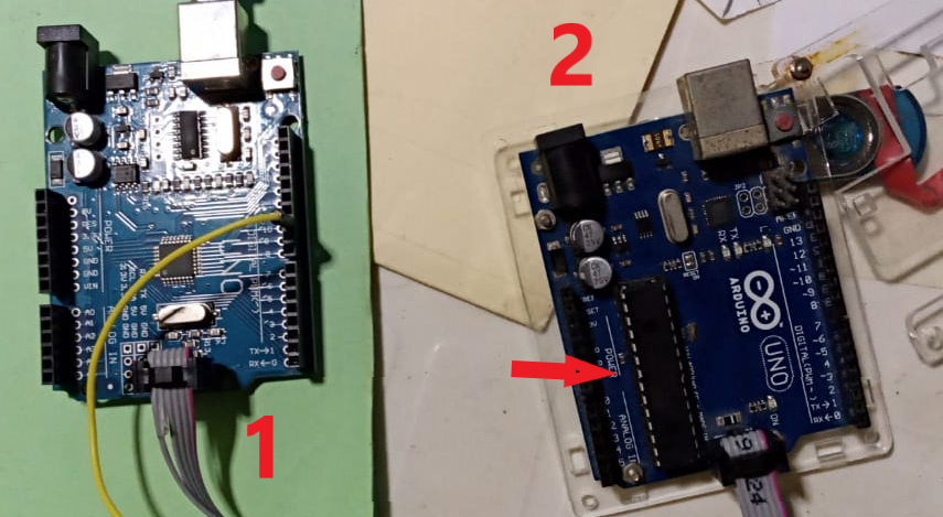 To program the atmeaga328 you used two arduinos, the first is the programmer and the second is to program it.