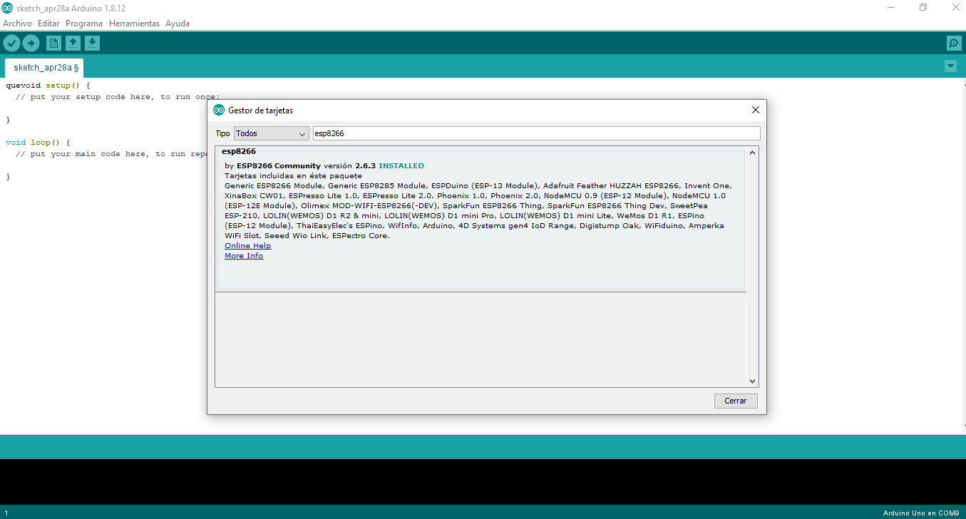 Now in the tools menu select board and then card manager. Write esp8266 and install