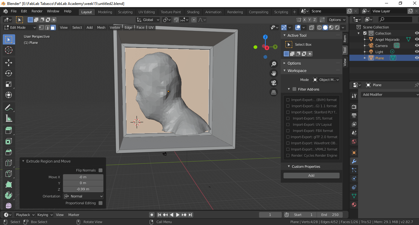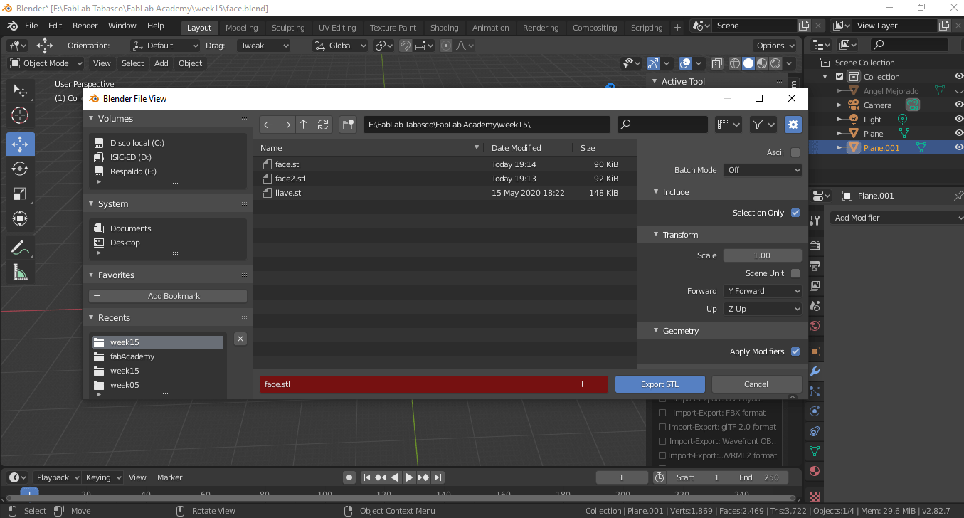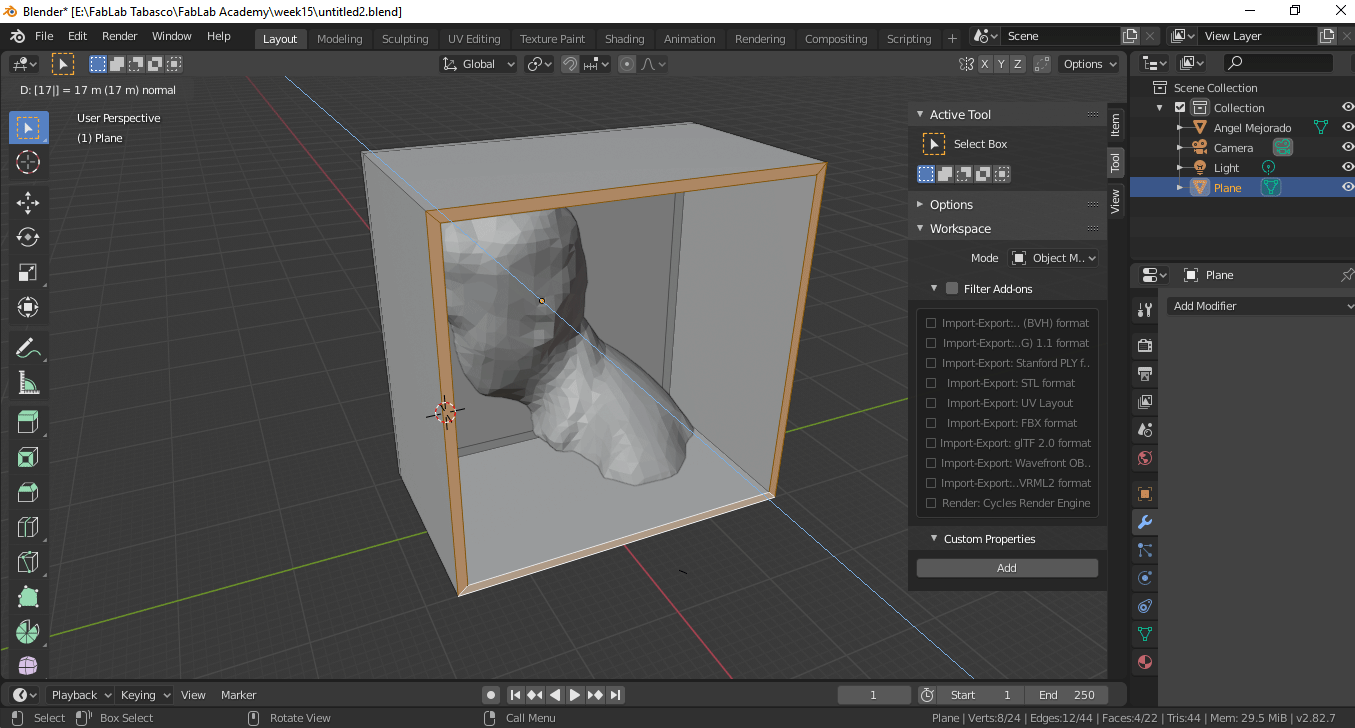 For this assignment I am going to design a two-sided mold, taking as models the 3d scan of my person that I used in the week of printing and 3d scanning for it I use Blender.