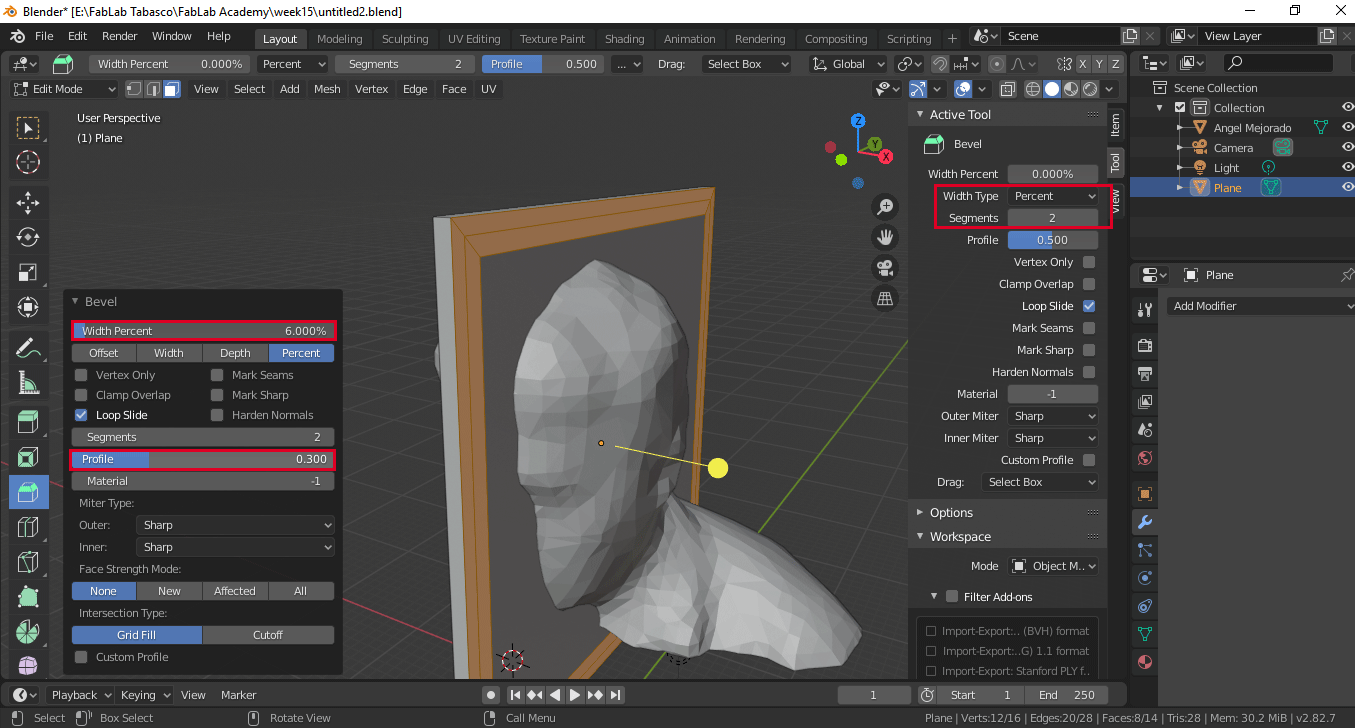 After designing the model, I extrude it (pressing the letter e) giving it a value of 1.2