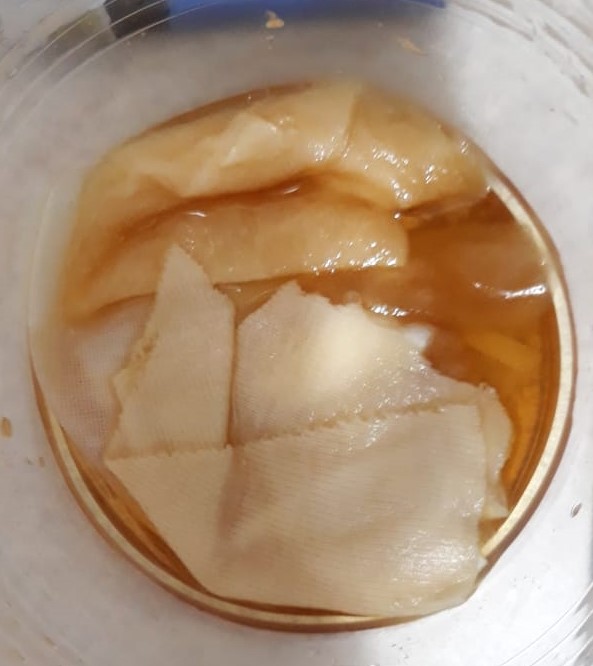 We have follow Cecilia recommendation to make our mordent. We left a pace of iron A36 outside and 3 raining days iron was oxidized. Then we put iron into a pot with vinegar and wait 2 days. At that point we find a nice yellow mordant. Then we put mordant into a recycle plastic glass with our cotton sheets and silk cocoons.