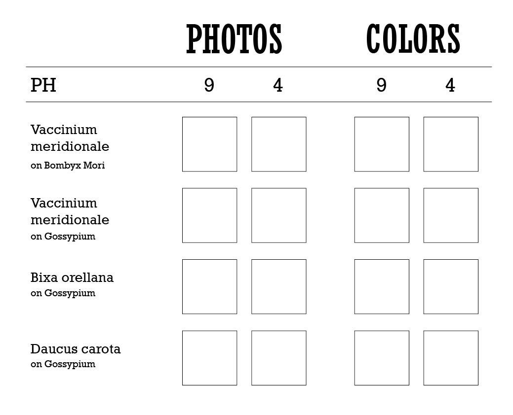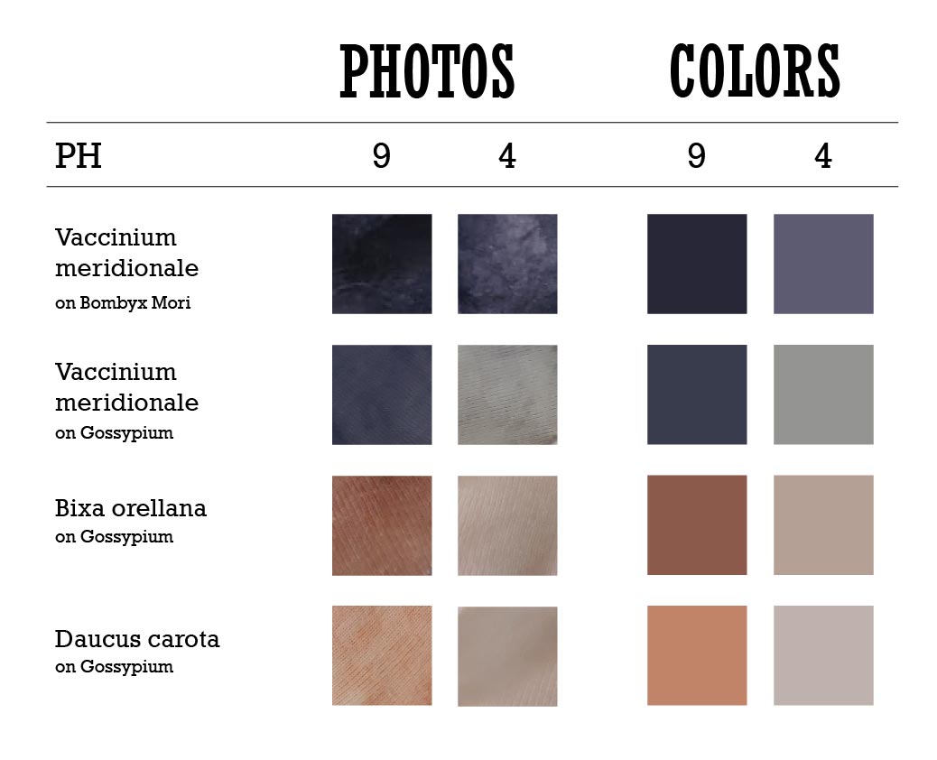 For this exercise David and I decide to use pure silk “Bombyx Mori” (the cocoon) to see how dye could attach to it. Also we use cotton “Gossypium” fabric to dye different botanical species. Also you may see PH variations we used.