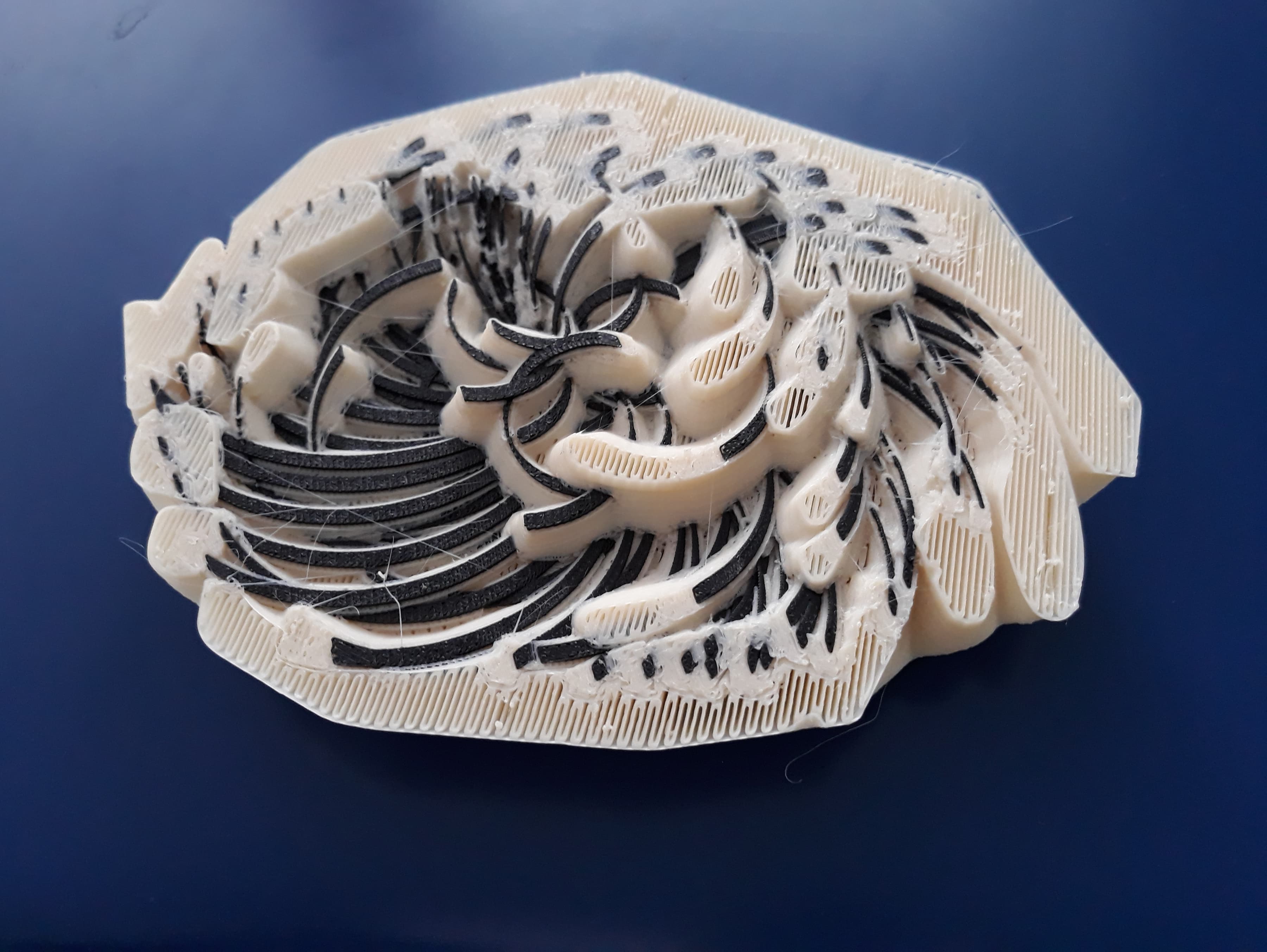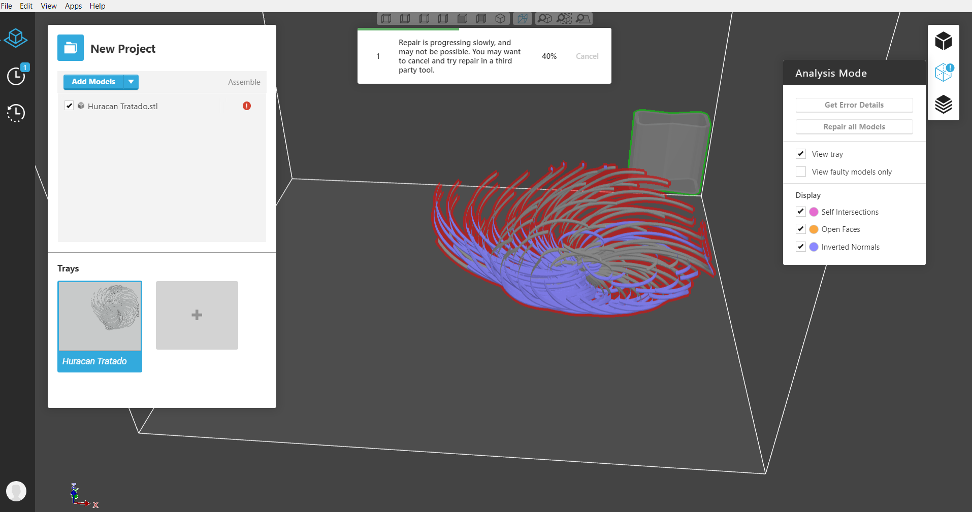 In the process of generating G-code this complex shape gives a lot of work to GrabCAD Print software to fix the model. So I used Meshmixer to fix it and even Meshmixer did a nice job GrabCAD needed almos 2 hours of process to generated G-code.