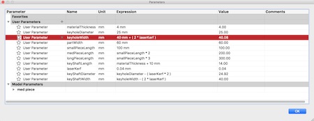 At this point I realized that some of my dimensions were off, so I added a few additional parameters. I included a parameter for my laser kerf.