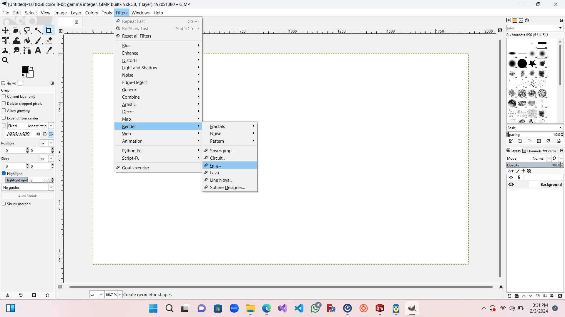 This creates a blank new Image. To draw the mobile robot platform, I am going to use one of the render filters called Gfig. these can be located from Filters > Render > Gfig