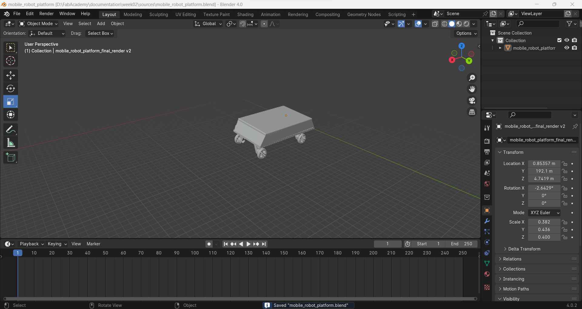 This week was a comprehensive exploration into the diverse realm of design tools, audio-video editing, and the integration of AI for generative graphics. To practice with some of the tools presented in the class, I will be drawing/designed a mobile robot platform in both the 2D and 3D tools as follows: