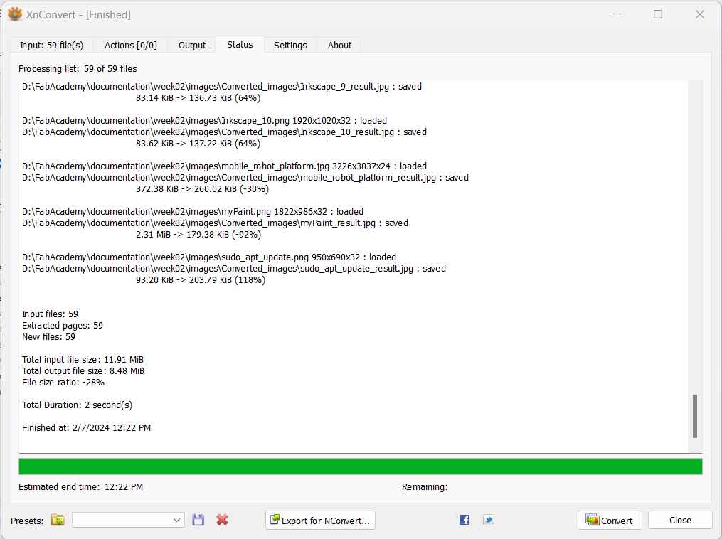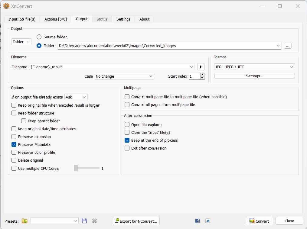 I opened xnConvert and added my source images folder, set up the output folder and set quality