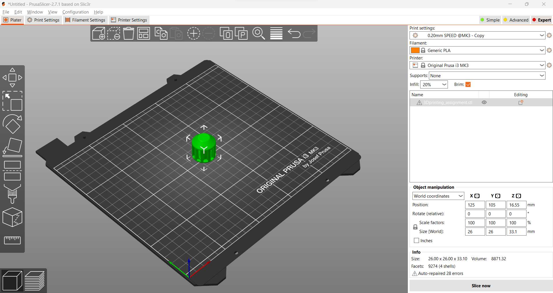 First I have exported the design as .stl file, then imported it with Prusa slicer: