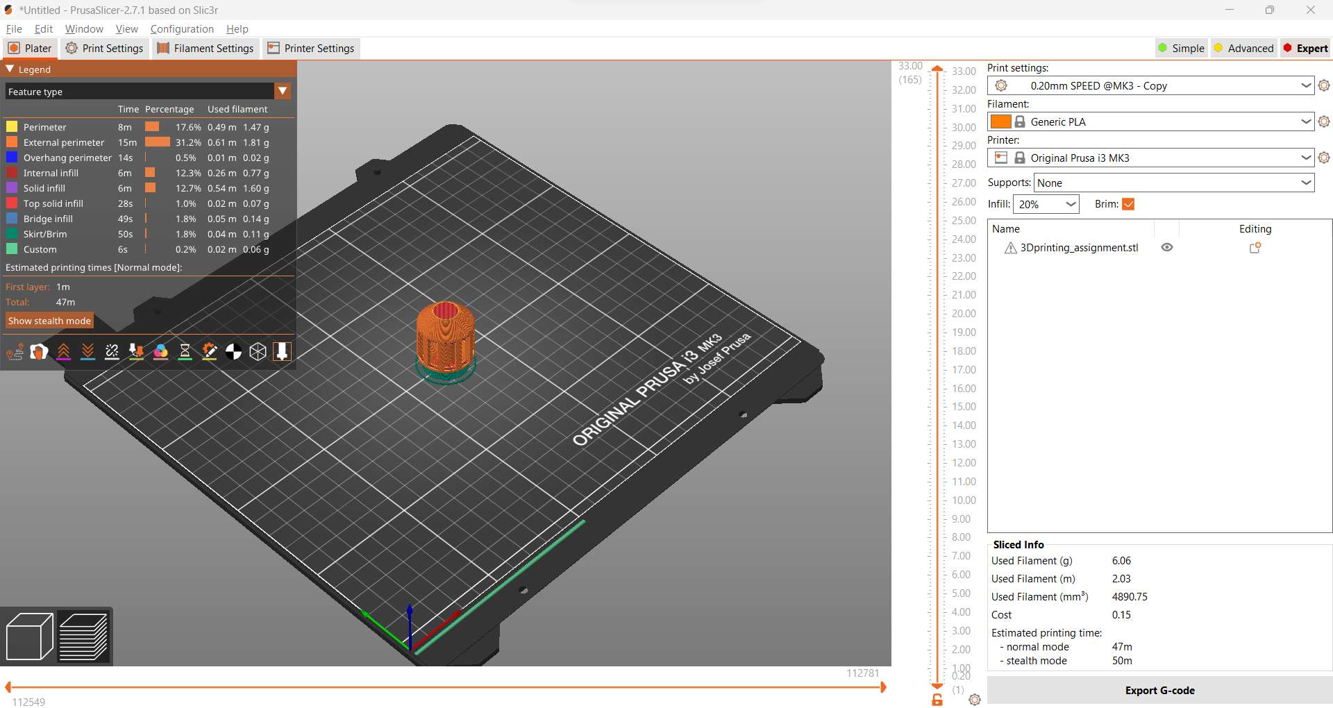 I chose PLA as the material, Original Prusa i3 MK3 printer in the printer setting and applied 20% infill with no support. To get a good print stability, I added brim. The clicked on slice now button: