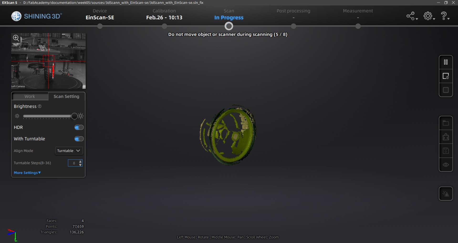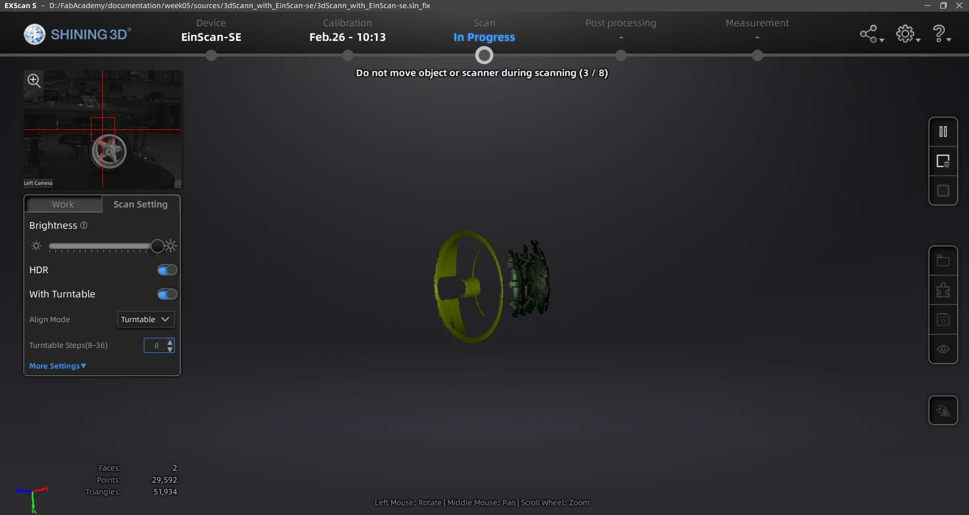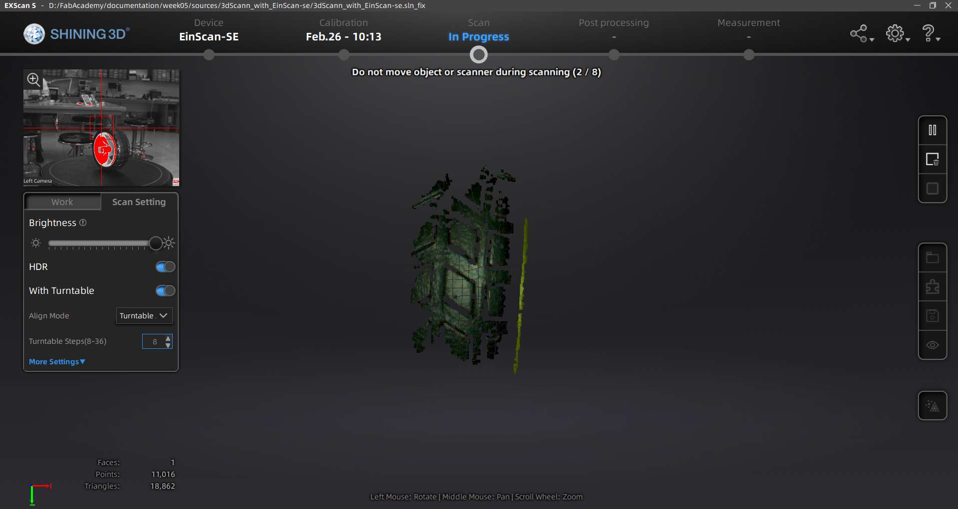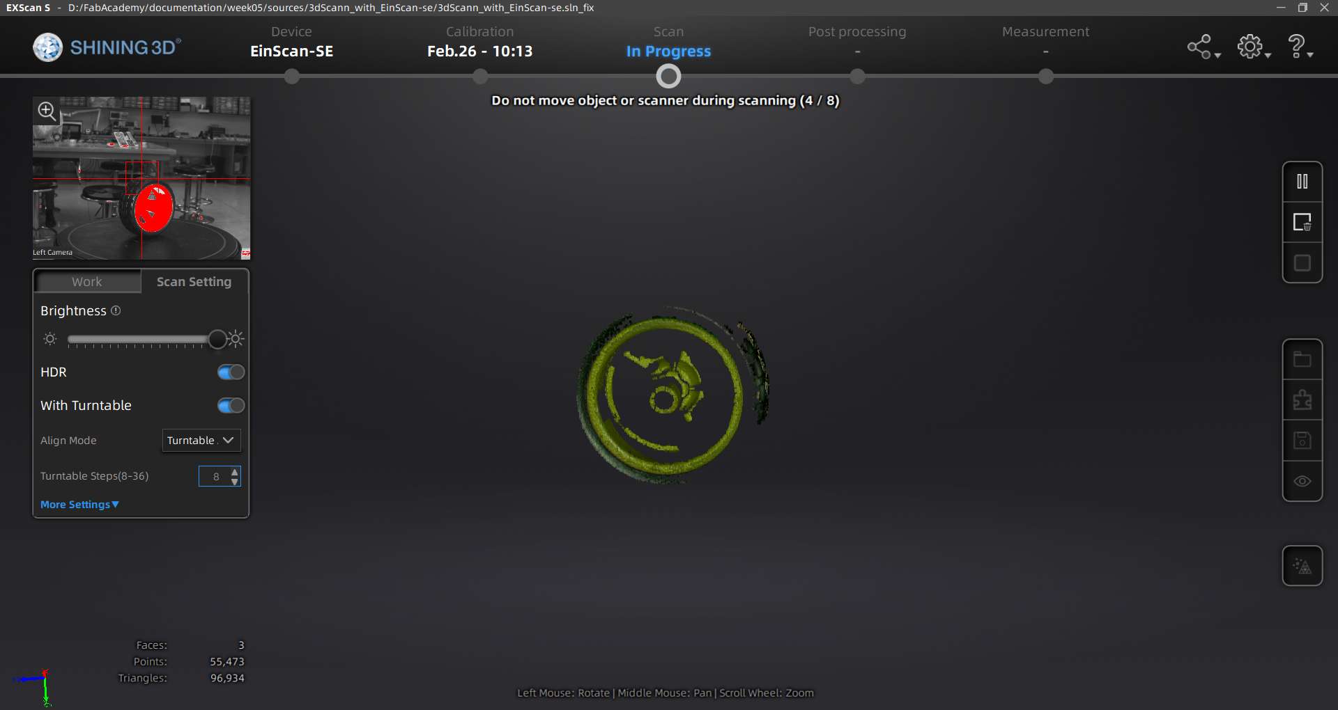 For the 3D scanning assignment, I utilized the Afinia EinScan-SE V2 3D Scanner in conjunction with the Turntable EINSCAN-SE V2. This scanner, available at B&H Photo Video , offers advanced capabilities for capturing highly detailed 3D scans with ease and precision. With its intuitive interface and robust hardware, the EinScan-SE V2 enables efficient scanning of various objects, delivering accurate and high-quality results. The included turntable further enhances the scanning process by automating rotation and ensuring comprehensive coverage of the object from all angles. Overall, the combination of the Afinia EinScan-SE V2 3D Scanner and Turntable provides a reliable solution for professional 3D scanning applications, empowering users to create detailed digital replicas for a wide range of purposes.