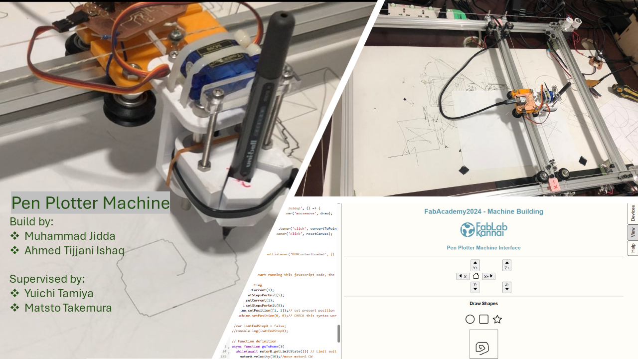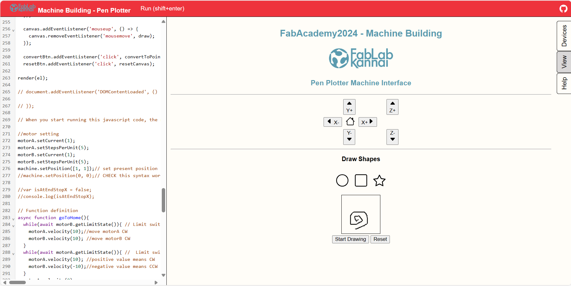 The machine is a CoreXY based pen plotter that works with a canvas so that anything that is drawn on the canvas can be plotted by the machine. Another feature added is the ability to draw shapes like circle, square and star easily by clicking on the shape.