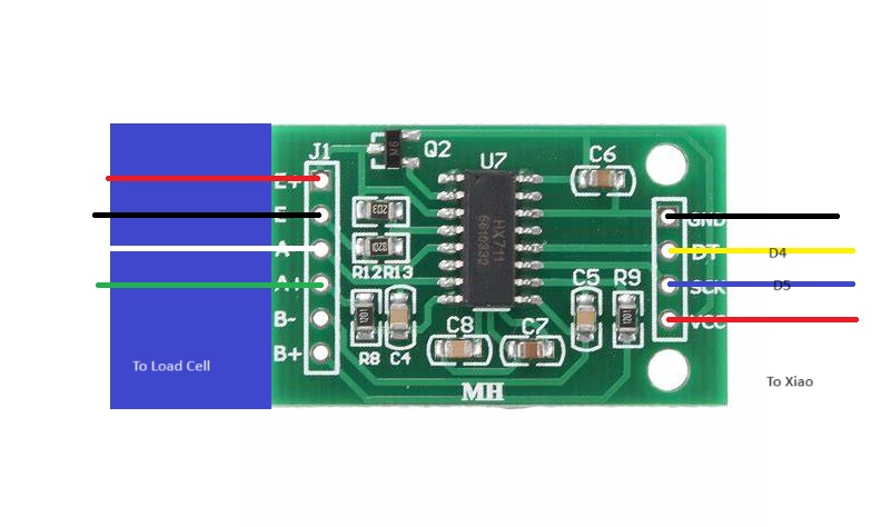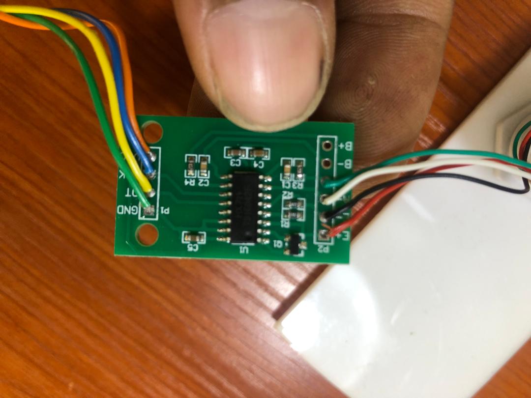 It comes with an amplifier and an Analog to Digital Converter (ADC) module consisting of an Hx711 chip. Bello is how to connect the module to the load cell and Xiao