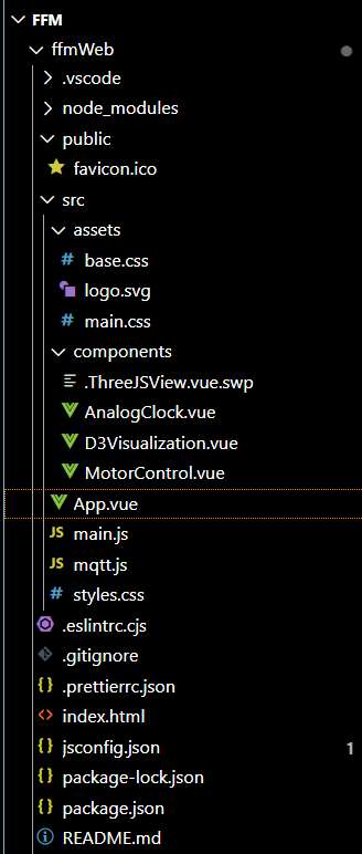 I then created three components: analog clock visualization of time from the RTC module using three.js, motor control for controlling the motor and a visual bar representing the speed of the motor using d3.js. The following is the folder structure for this project.