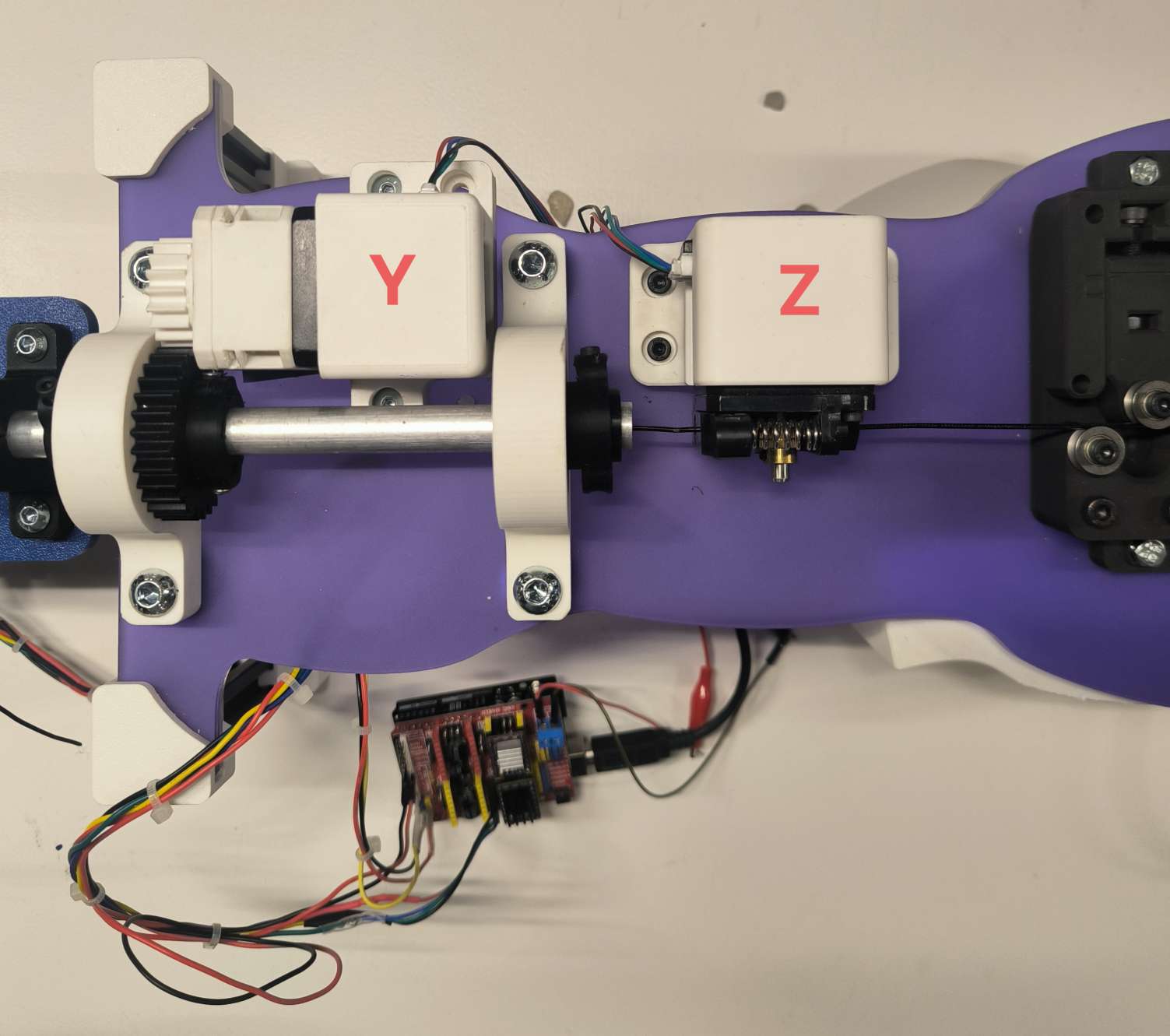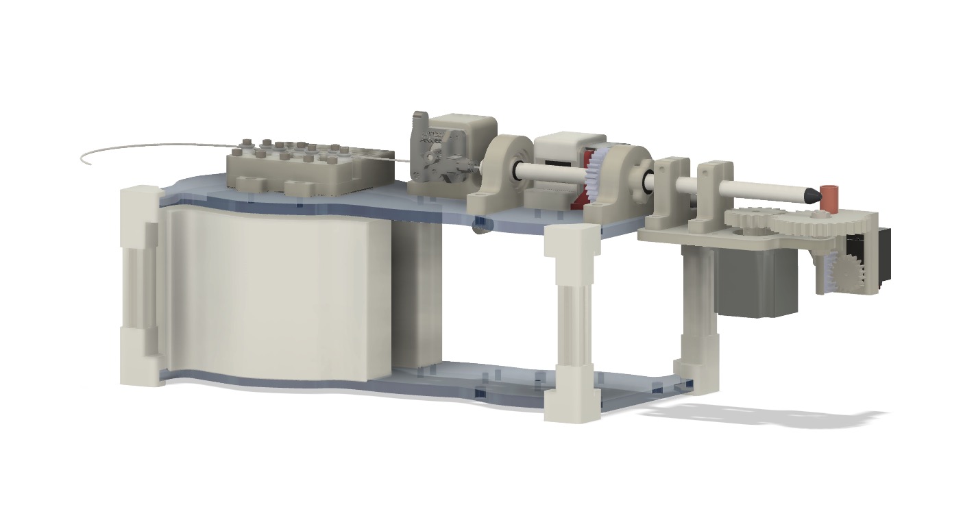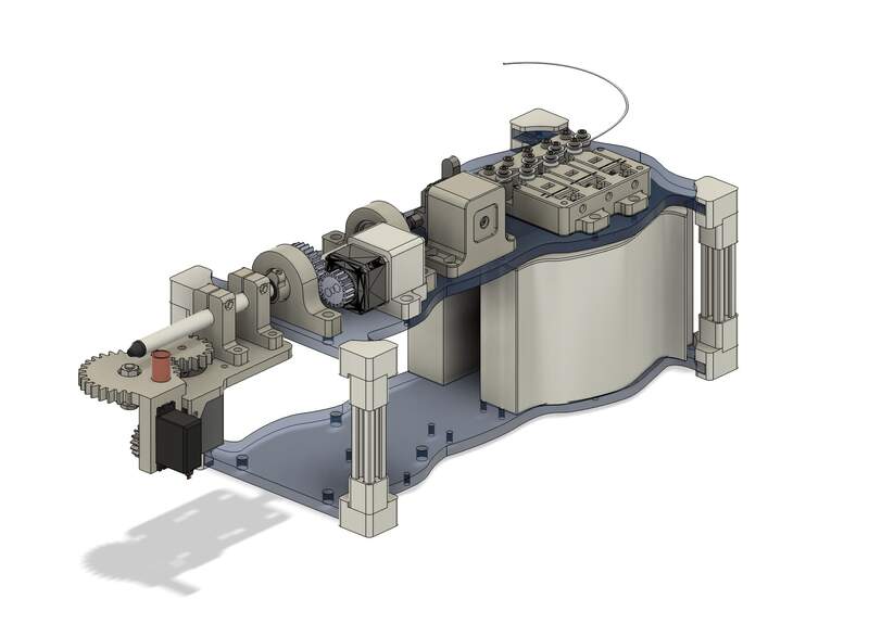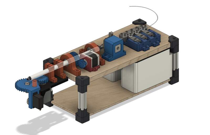 The mechanical design is a heavily modified version of the original design with a number of additions. Several pieces like the straightening assembly and the planetary gear reduction were adapted from pre-existing designs (straightener and planetary gear reducer). Additionally, the extrusion mechanism is produced by Creality and can be sourced here. All fasteners are common metric machine screws and bolts. These fasteners can be sourced at your local hardware store. The aluminum pipe may be tricky to source as it was just scrap laying around the lab. Fits have been adjusted for a well calibrated 3D printer (we used a Bambu Carbon X1).