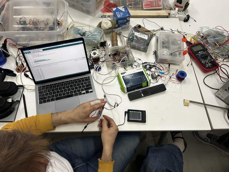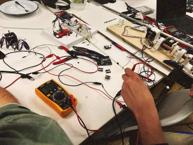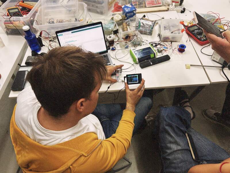 Here we used an Oscilloscope to sample serial communication on the Barduino. This was from a tutorial that Dani did in class. We subsequently went over this process several times. Here we were using the Oscilloscope to view a pin sending serial communication. Interestingly we were able to observe that the longer the serial message the more numerous the pulses were. In the week after we used the Oscilloscope extensively to confirm correct functioning of the stepper motor drivers for our CNC Wire bender we developed for machine week.
