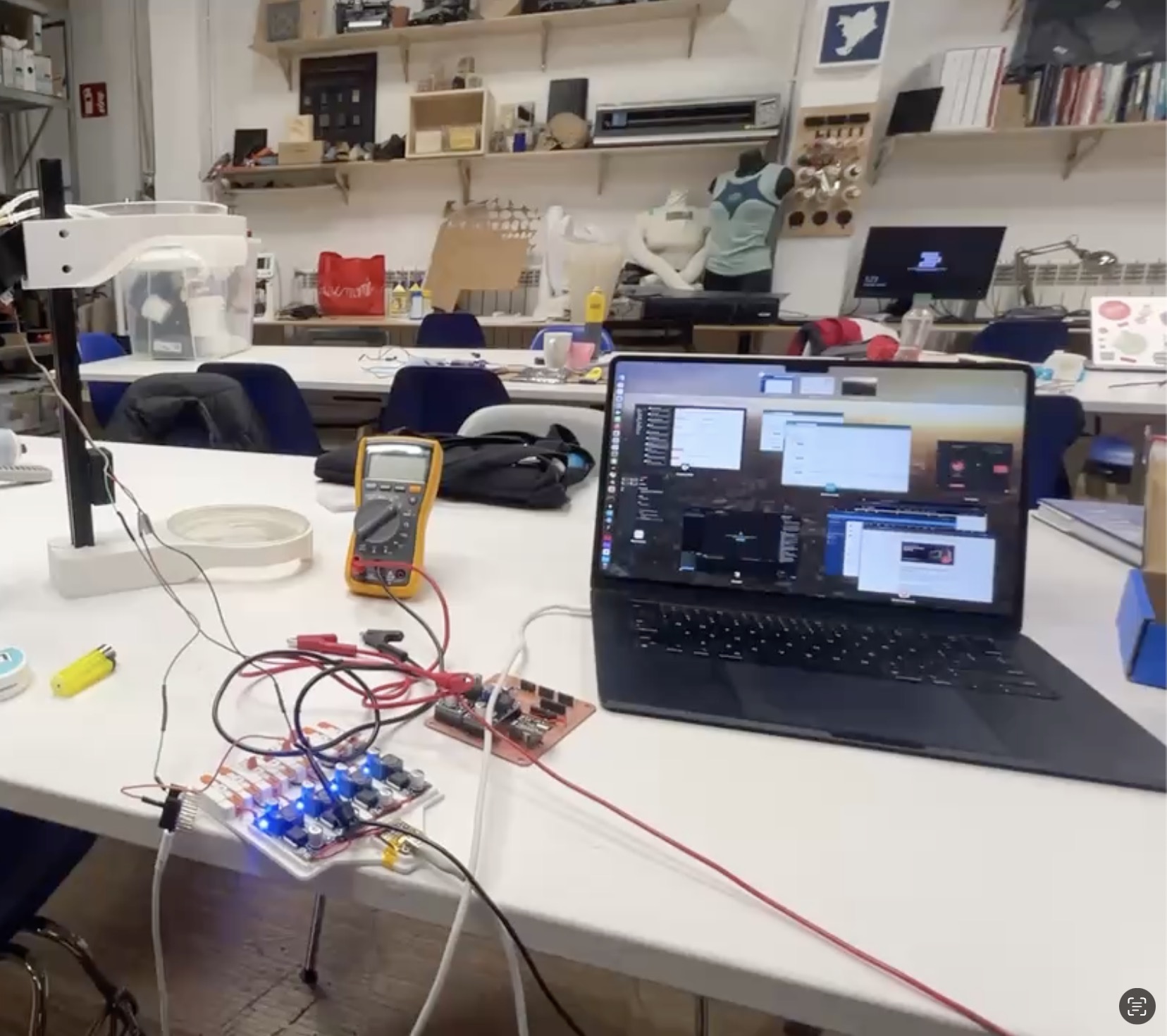 This was a project that Andrew was setting up for his final project. To start the continuity function on the meter was used to check for shorts on the original milled board. The 4x buck converters pictured are used as a way of sending out individual voltages to test different output devices. To configure the voltages each buck converter needs to have a small trimmer potentiometer adjusted with a multimeter hooked up to its output that is set up to measure Voltage DC. This allows you to observe the output voltage as you adjust to the target voltage. Additionally, once the whole test rig was set up it was confirmed that the Xiao was receiving adequate voltage to power it (+5V).