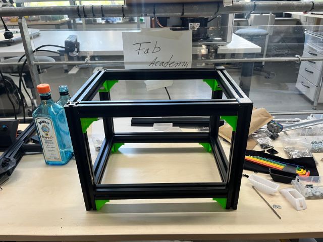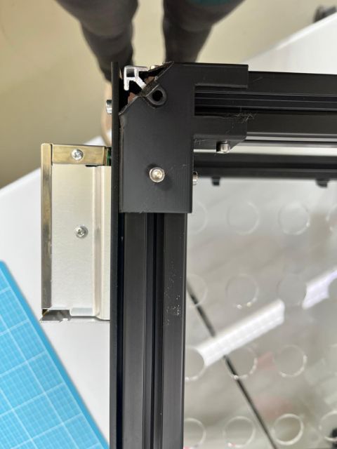 Since these automatic fasteners tended to slightly bend the aluminum extrusions out of shape we only used them for the lower part of the frame and went with a 3D printed solution for the top.