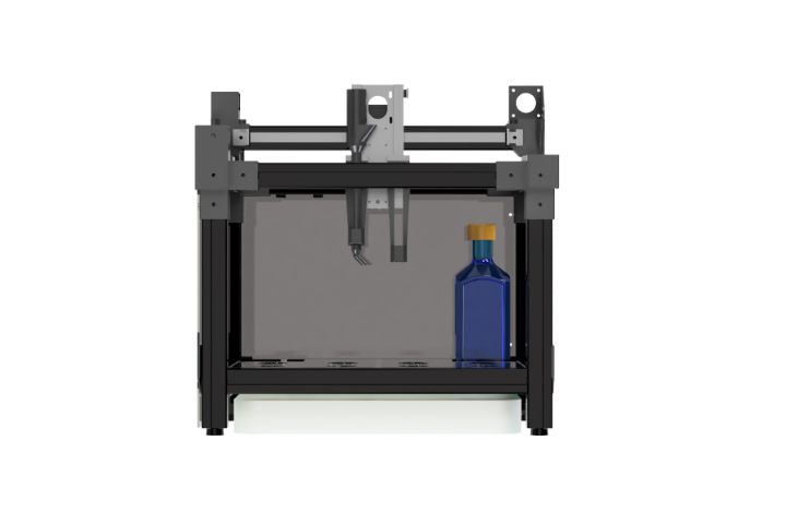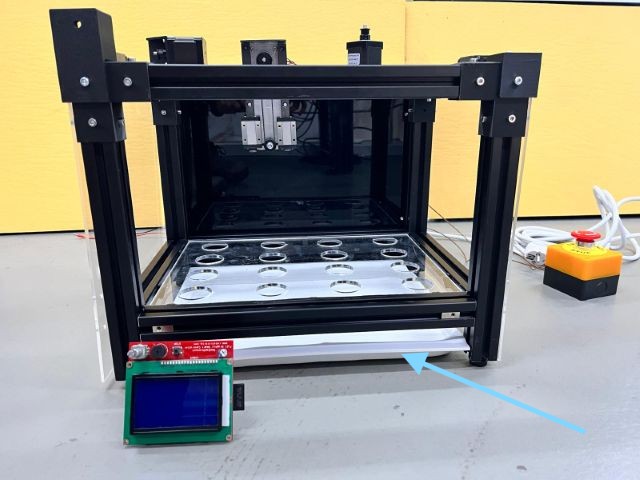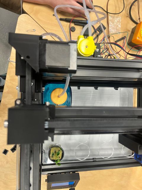 Our watering head is part of an automated system that pumps water from a bottle using a peristaltic pump and delivers it through a tube into the main working area.