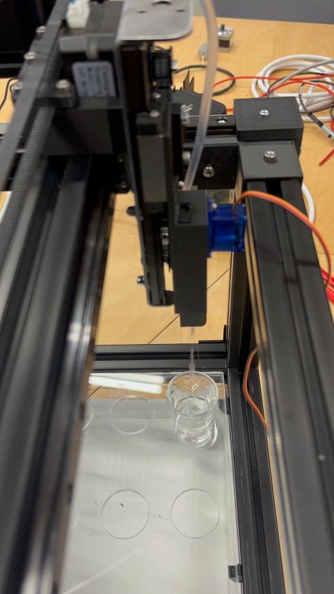 There, the water is released through a vertically downward-facing hose attached to the watering head, which waters the plants precisely. The head is mounted on a movable carriage that can be adjusted vertically. This allows the distance to the plant to be adapted depending on its growth stage. For filling our shot glasses with precision, the carriage moves all the way down to avoid spilling even a single drop.