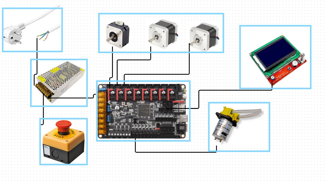 Here you can see the electronic components and how they are powered. We use a standard Schuko plug to supply power to the power supply unit. From there, the power is routed to the BigTreeTech Octopus V1.1 board, which is connected to the stepper motors, the peristaltic pump, and the RepRapDiscount Full Graphic Smart Controller. Additionally, we have integrated an emergency stop button that is directly connected to the power supply, allowing the entire machine to be shut off quickly in case of an emergency.