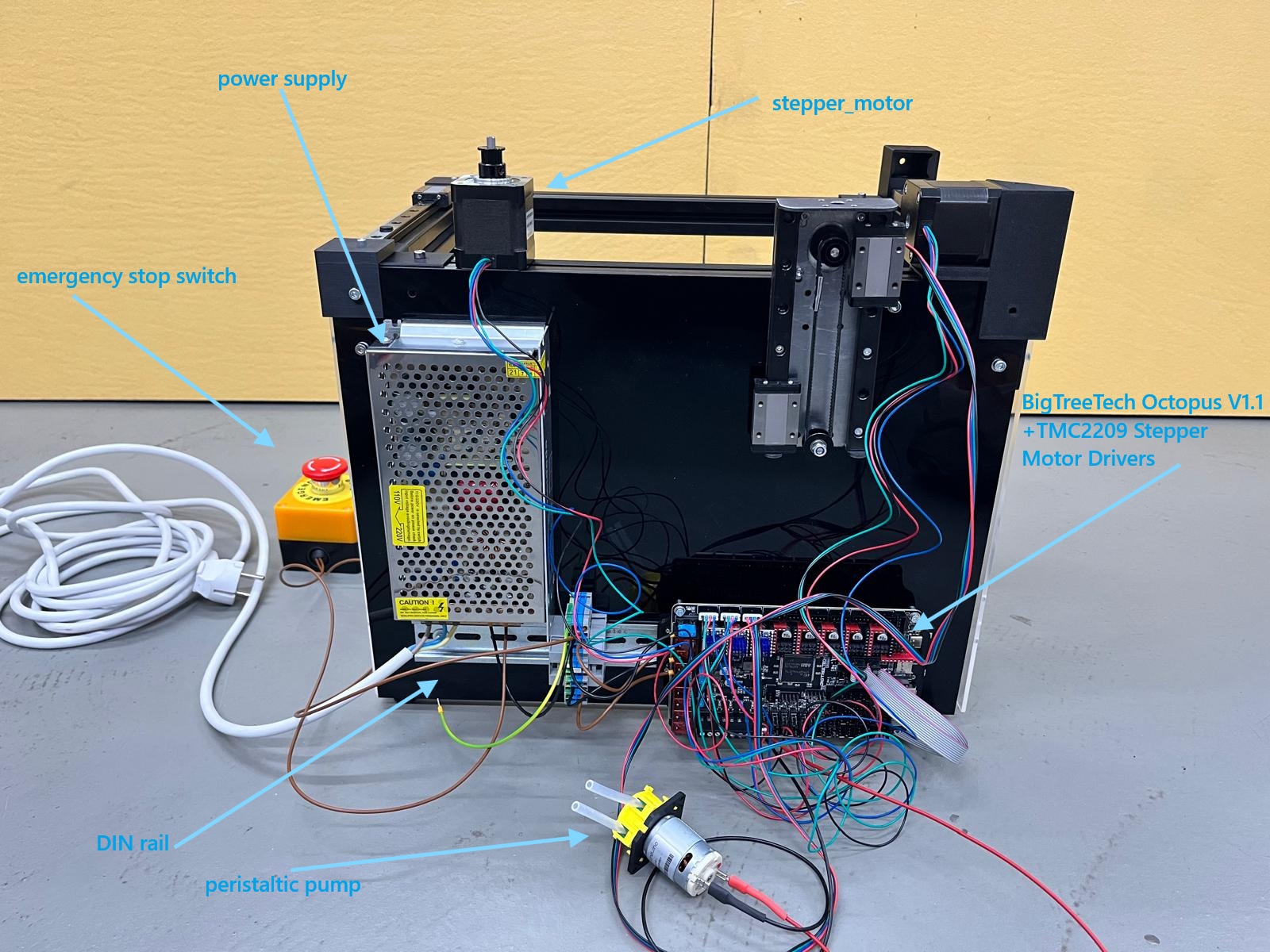 For our mechanical system, we use a peristaltic pump to transport water, controlled by a Marlin board (BigTreeTech Octopus V1.1). The board is equipped with TMC2209 stepper motor drivers and powered by a 24V 5A power supply connected to the mains. Both the board and the power distributor are mounted on a DIN rail, allowing for safe grounding if necessary. Three stepper motors are connected in total, and for safety, we have integrated an emergency stop button.
