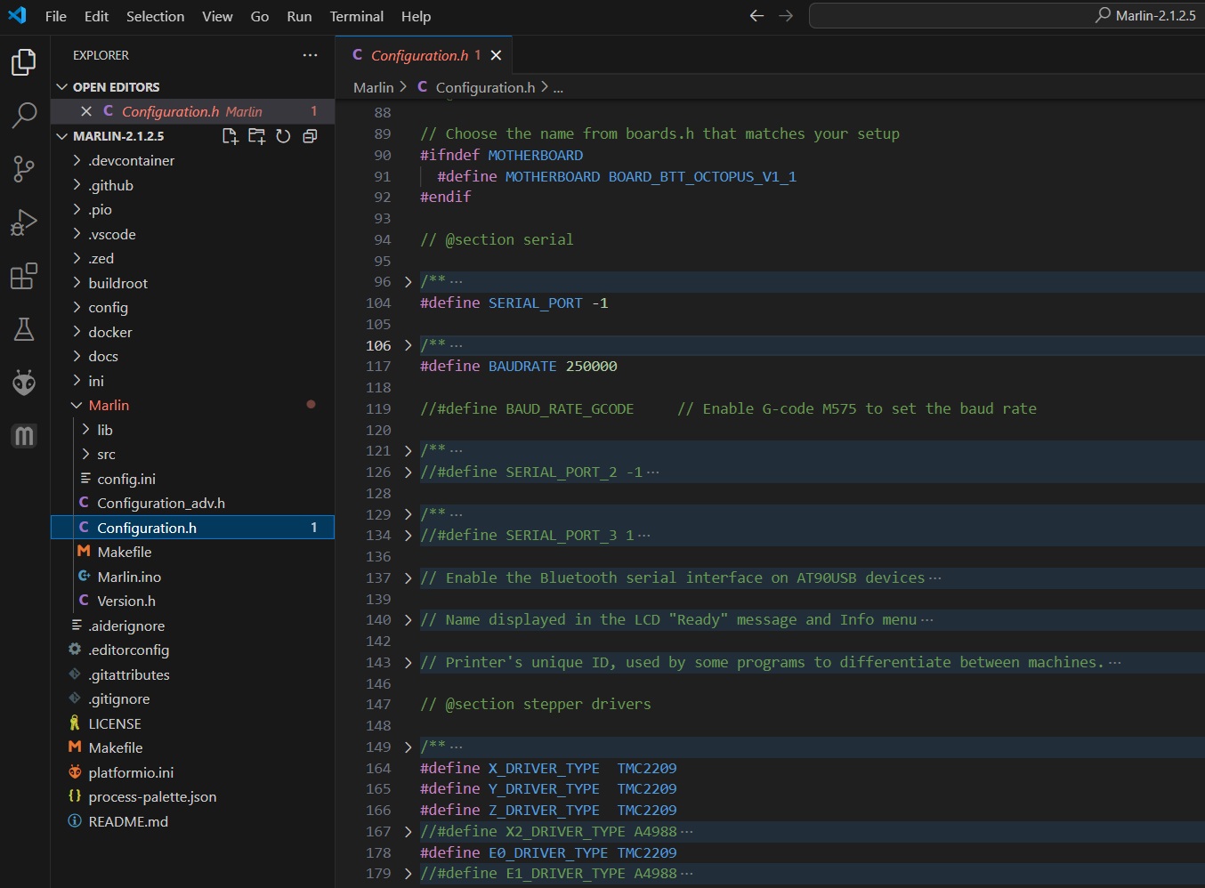 In Configuration.h we set up the BigTreeTech Octopus V1.1 as the motherboard and changed the stepper motor drivers for X,Y,Z and E0 to TMC2209.