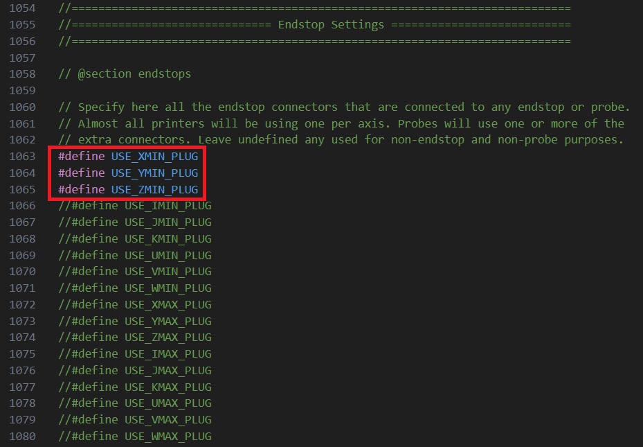 Further down in the configuration file we then enabled endstops for all of our axes.