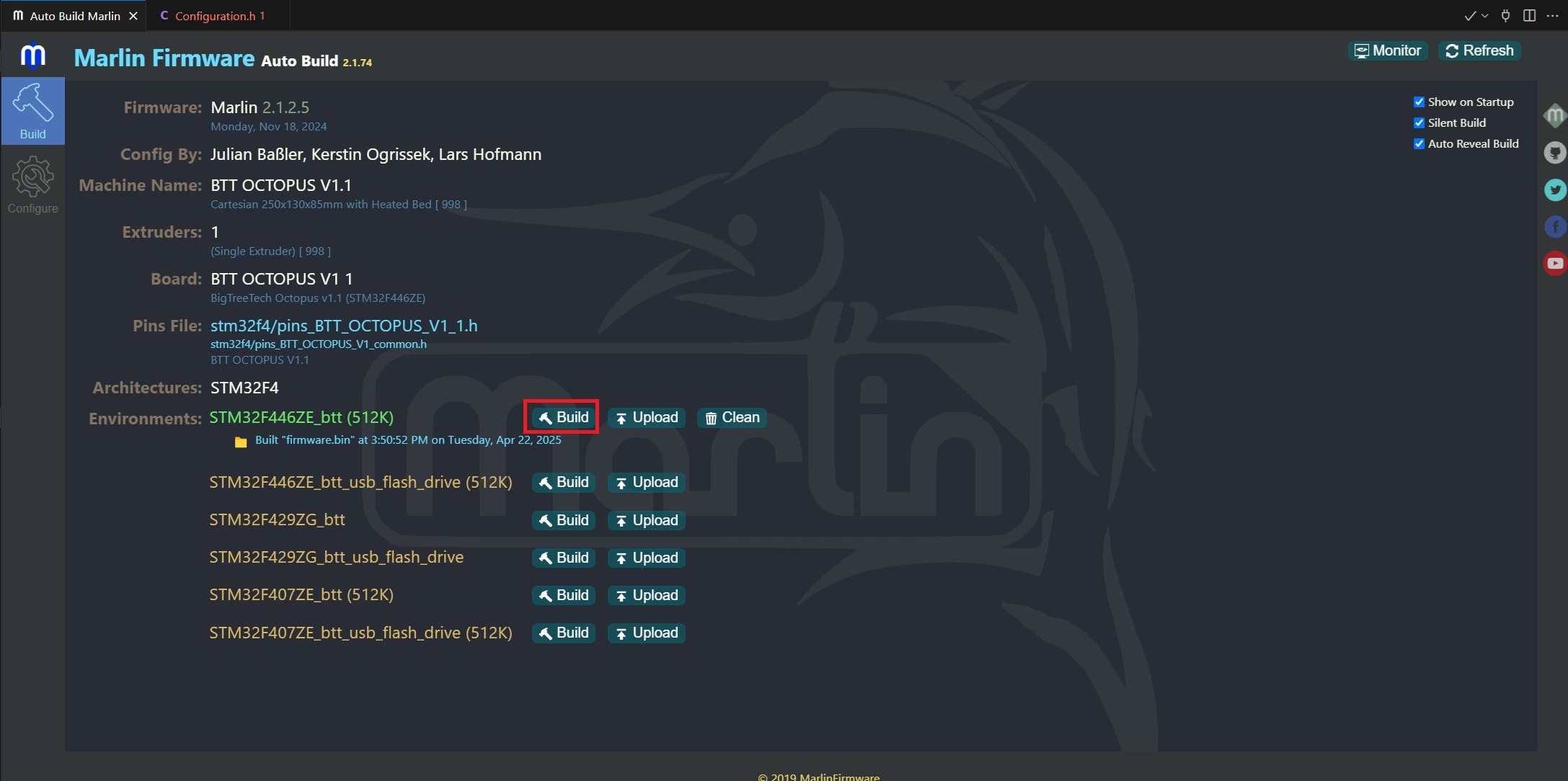 That pretty much covers all the relevant changes. We next headed over to the Auto Build Marlin extension and built a firmware binary file that we could save onto a micro SD card.