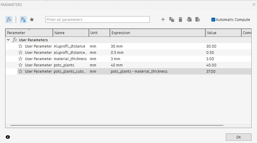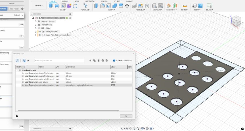 For the holder grid for containers – such as plant pots and cups – we designed a laser-cut plate that is 5 mm thick and measures 344 mm × 244 mm.
